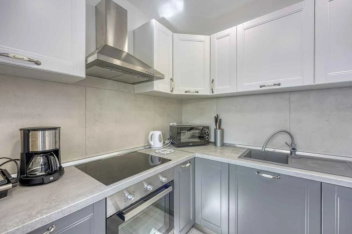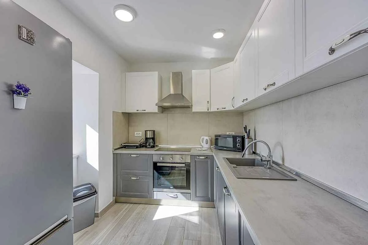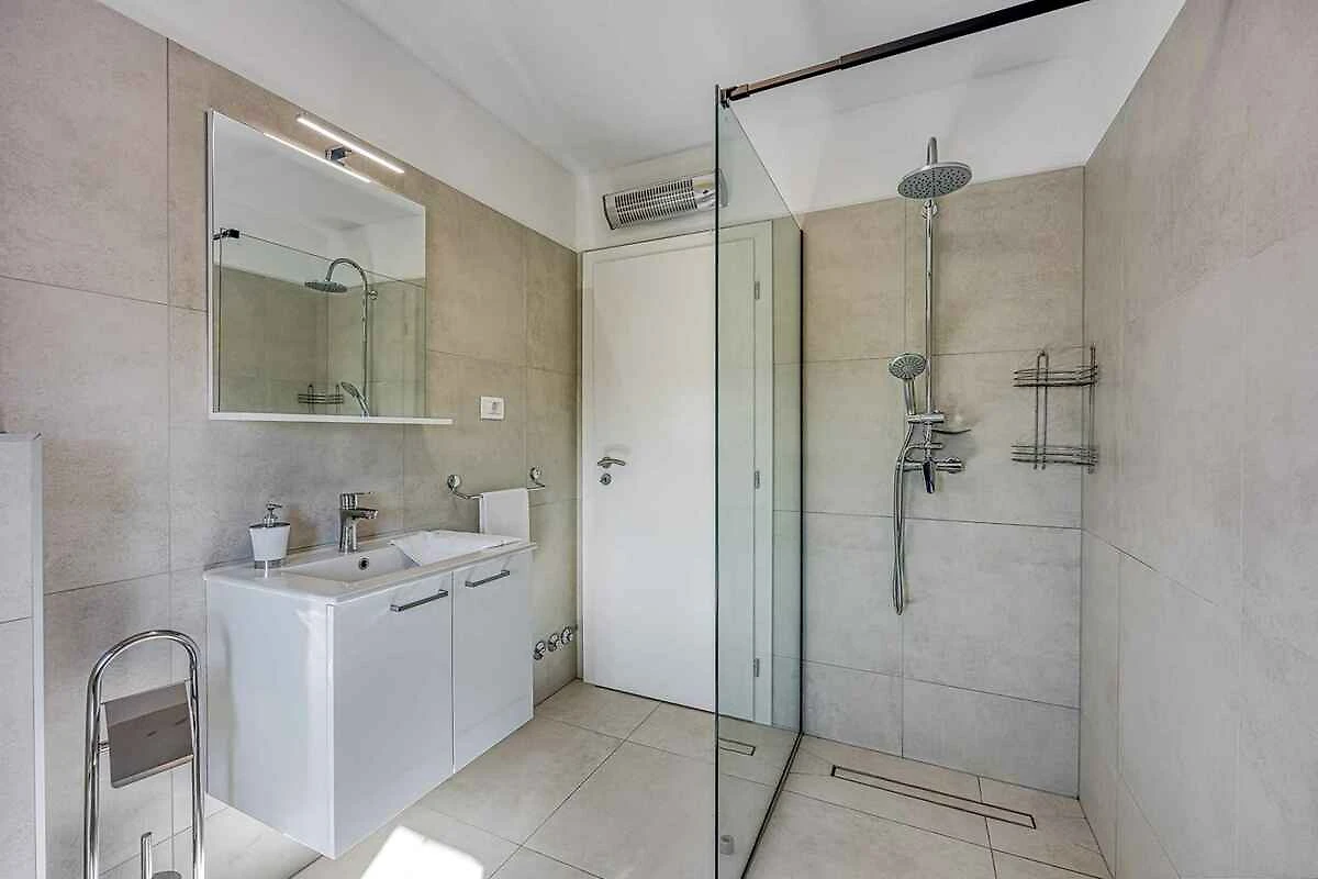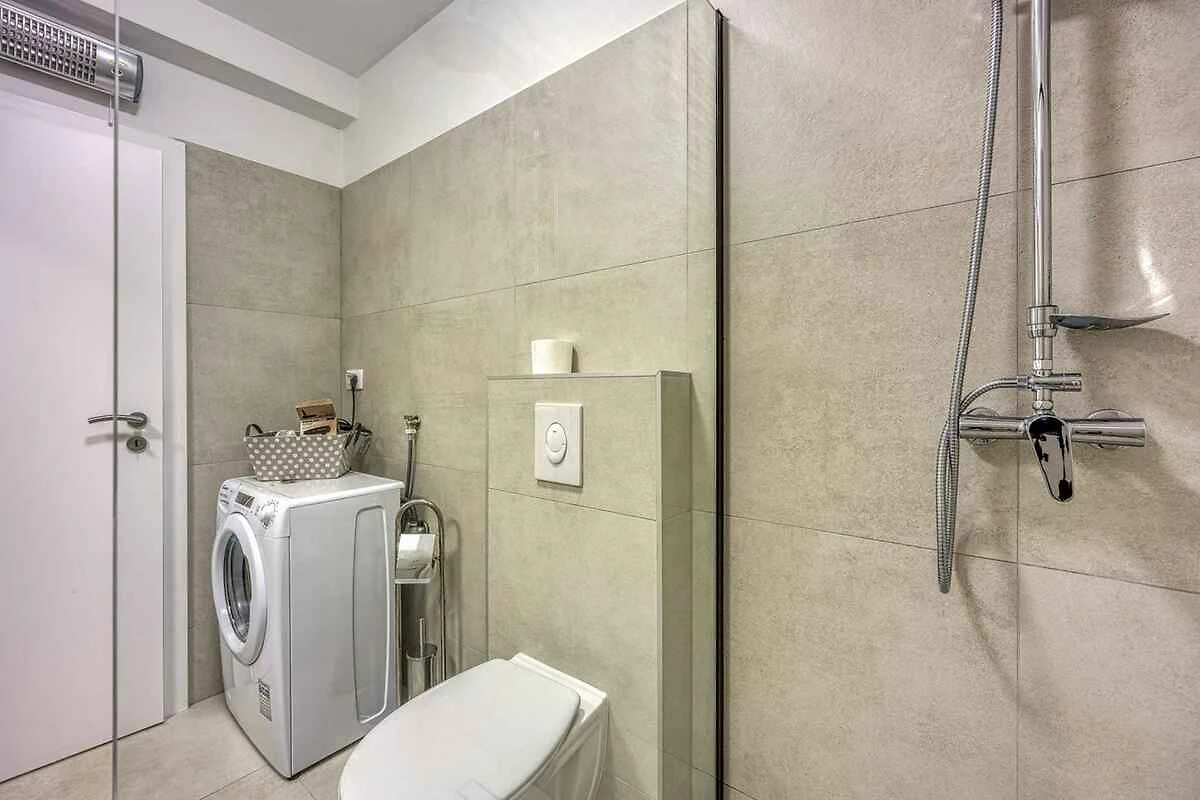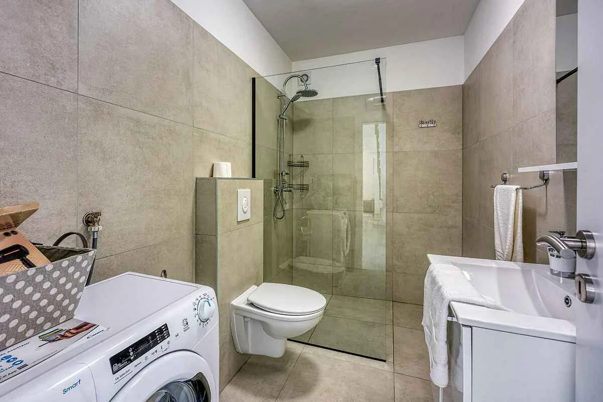 Wohnzimmer. Schlafzimmer mit 2 Einzelbetten. 2 Schlafzimmer jeweils mit 1 Doppelbett. Küche mit Gasherd, Backofen, Geschirrspüler, Kühlschrank (Eisfach), Mikrowelle, Kaffeemaschine, Toaster und elektrischem Wasserkocher. 2 Bäder jeweils mit Waschmaschine, Dusche und Föhn.