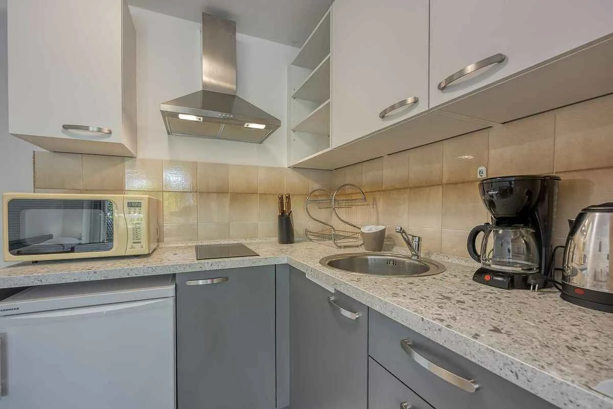 . Wohnzimmer mit 2 Zusatzbetten auf Couch/Sofa, TV, Essecke und Zugang zum Balkon (Gartenmöbel). Schlafzimmer mit 1 Doppelbett. Kochecke im Wohnzimmer mit Gasherd, Kühlschrank und Kaffeemaschine. Bad mit Dusche.