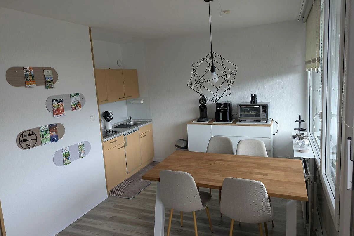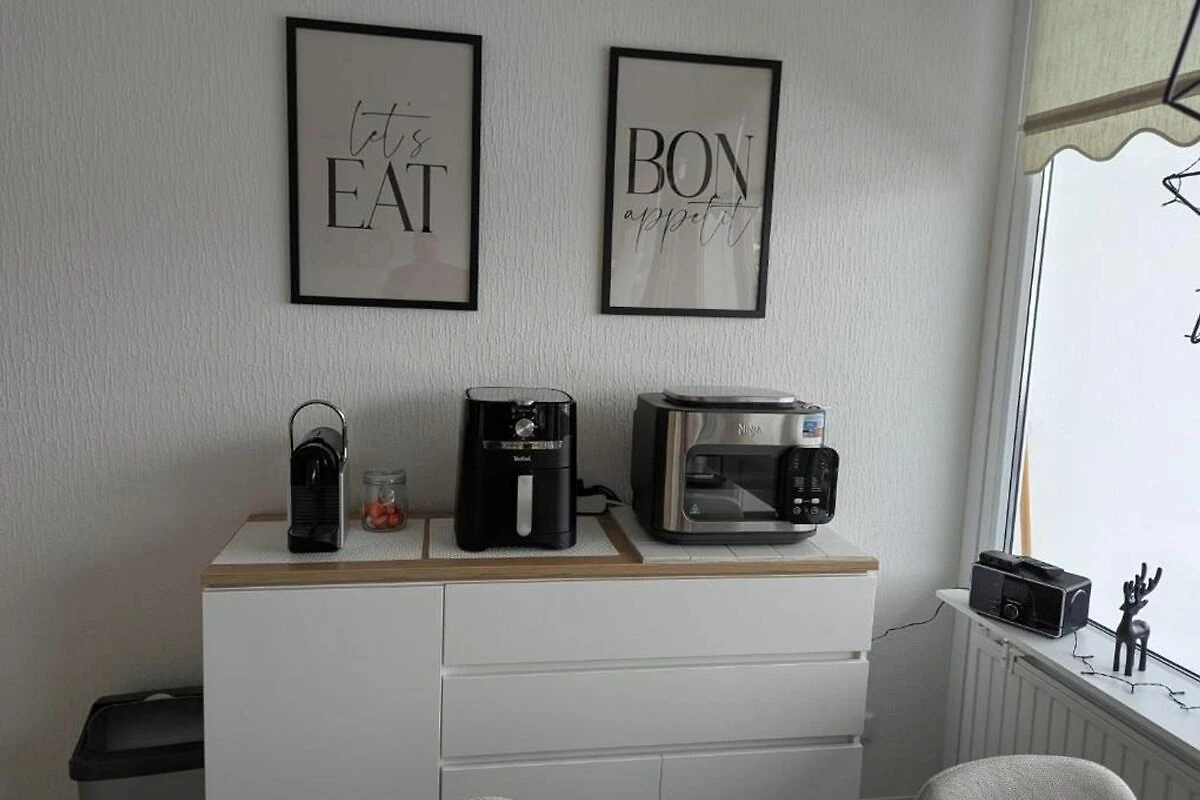 Die Küche ist vollständig ausgestattet mit allem, was man im Urlaub benötigt. Ein Herd, ein Kühlschrank, eine Kaffeemaschine sowie ein Wasserkocher, ein Toaster, eine Heissluftfriteuse und eine Senseo sind dort vorhanden.