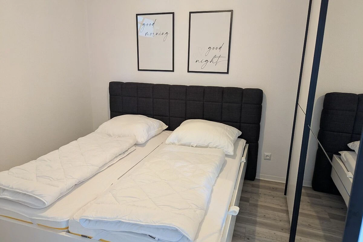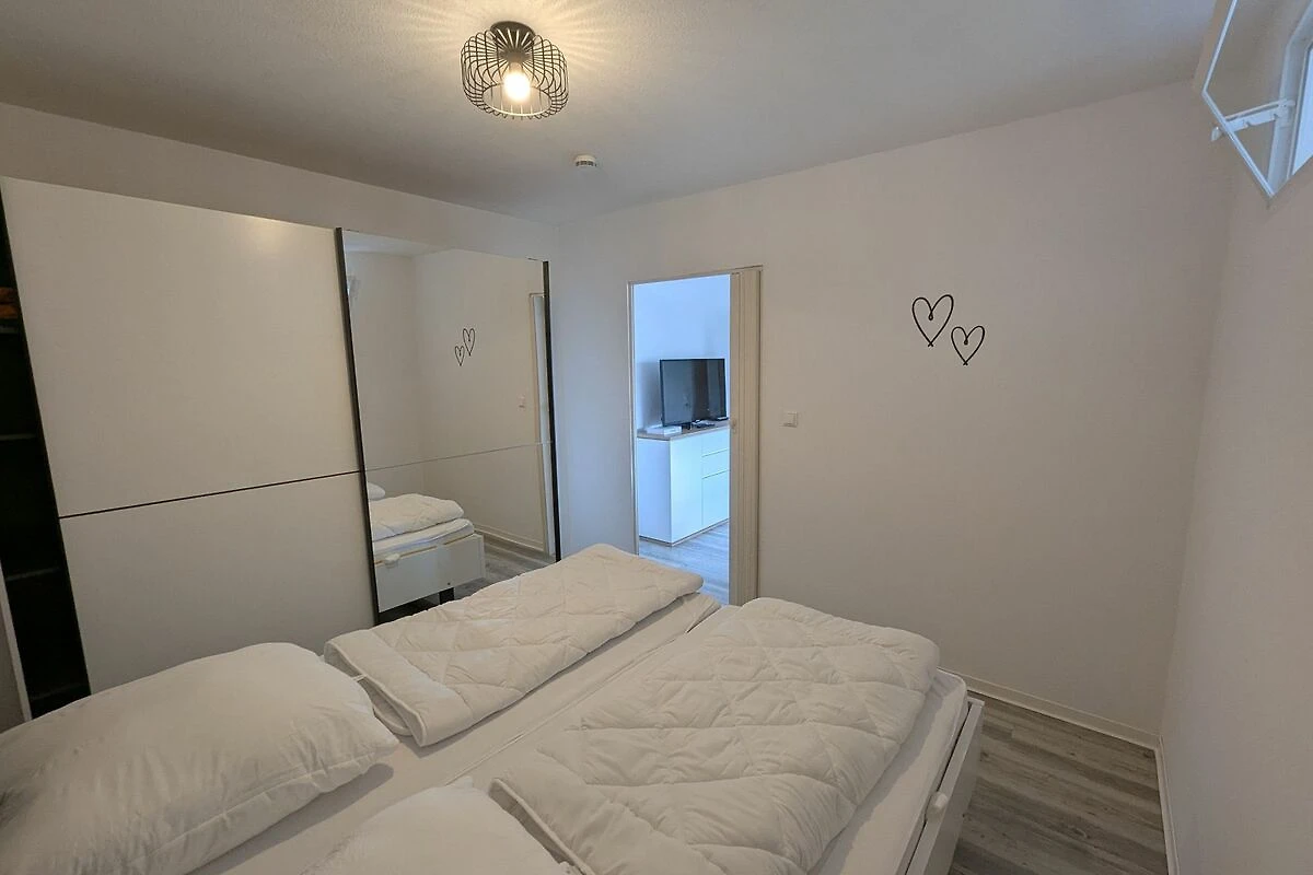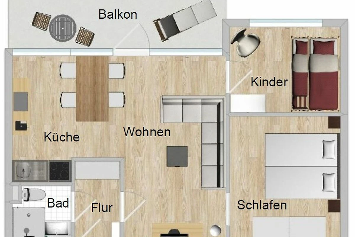 An Schlafmöglichkeiten fehlt es Ihnen nicht. Die Wohnung verfügt über bequemes Doppelbett im Schlafzimmer, sowie einem Etagenbett im Kinderzimmer. Das Etagenbett hat unten eine breite von 1,40 m und oben von 0,90 m.