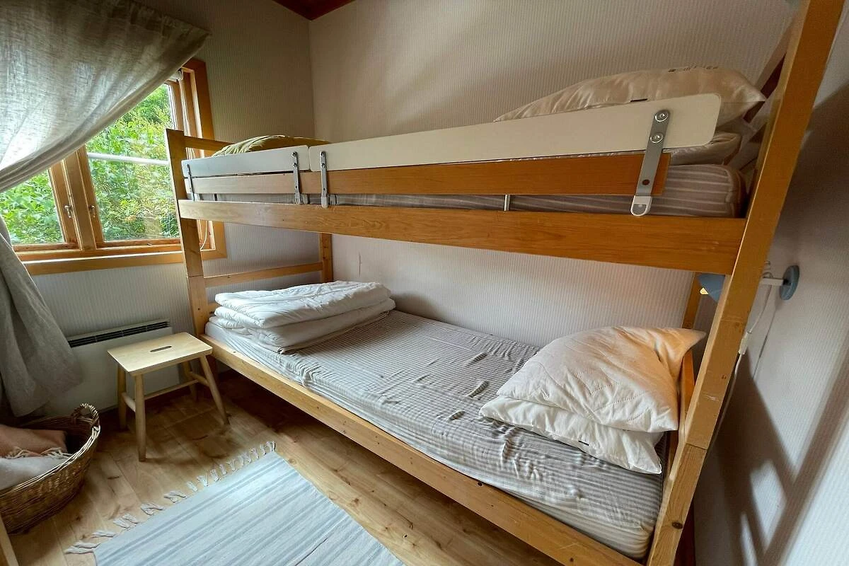 , Wohnzimmer(Doppelklappbett , TV(schwedische Fernsehsender), Kochherd(2 Kochplatten), Kaffeemaschine, Backofen(mini), Kühlschrank), Wohnzimmer(2x Einzelbett), Schlafzimmer(2x Etagenbett), Badezimmer(Waschbecken, Dusche, Toilette), Heizung(elektrisch), Gartenmöbel, Parkplatz
