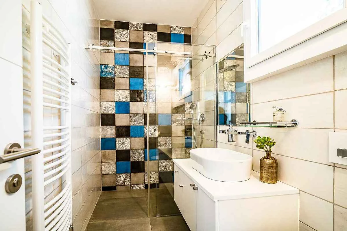 Der Eingang in Ihre Villa ist ebenerdig und führt direkt in das Wohn/Schlafzimmer. Wohn/Schlafzimmer mit 2 Zusatzbetten auf Couch/Sofa, TV und Essecke. Schlafzimmer mit 3 Einzelbetten. Schlafzimmer mit 1 Doppelbett. Kochecke im Wohn/Schlafzimmer mit Elektroherd, Backofen, Geschirrspüler, Kühlschrank (Eisfach), Mikrowelle, Kaffeemaschine und Toaster. 3 Bäder jeweils mit Dusche, 1 Waschbecken, WC und Föhn.