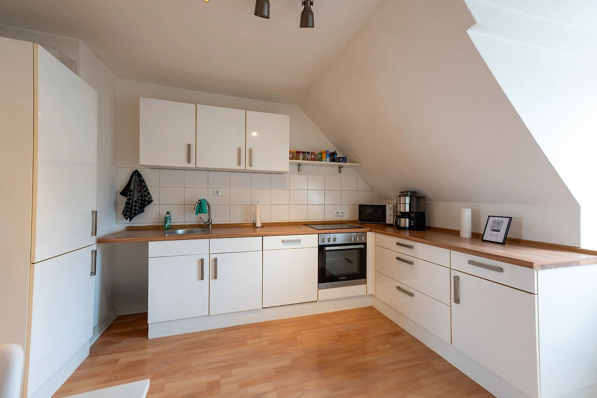 * Voll ausgestattete Küche mit Herd, Backofen, Kühlschrank, Kaffeemaschine, Wasserkocher, Töpfen, Pfannen & Geschirr