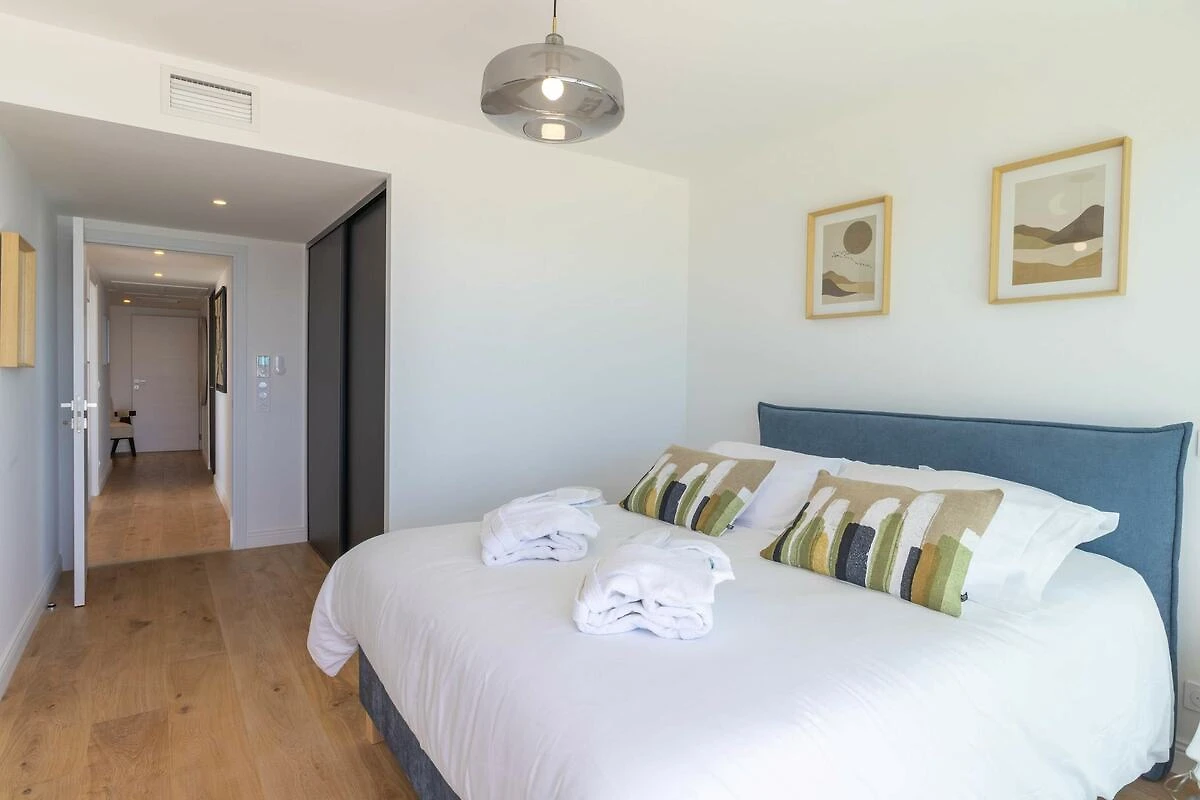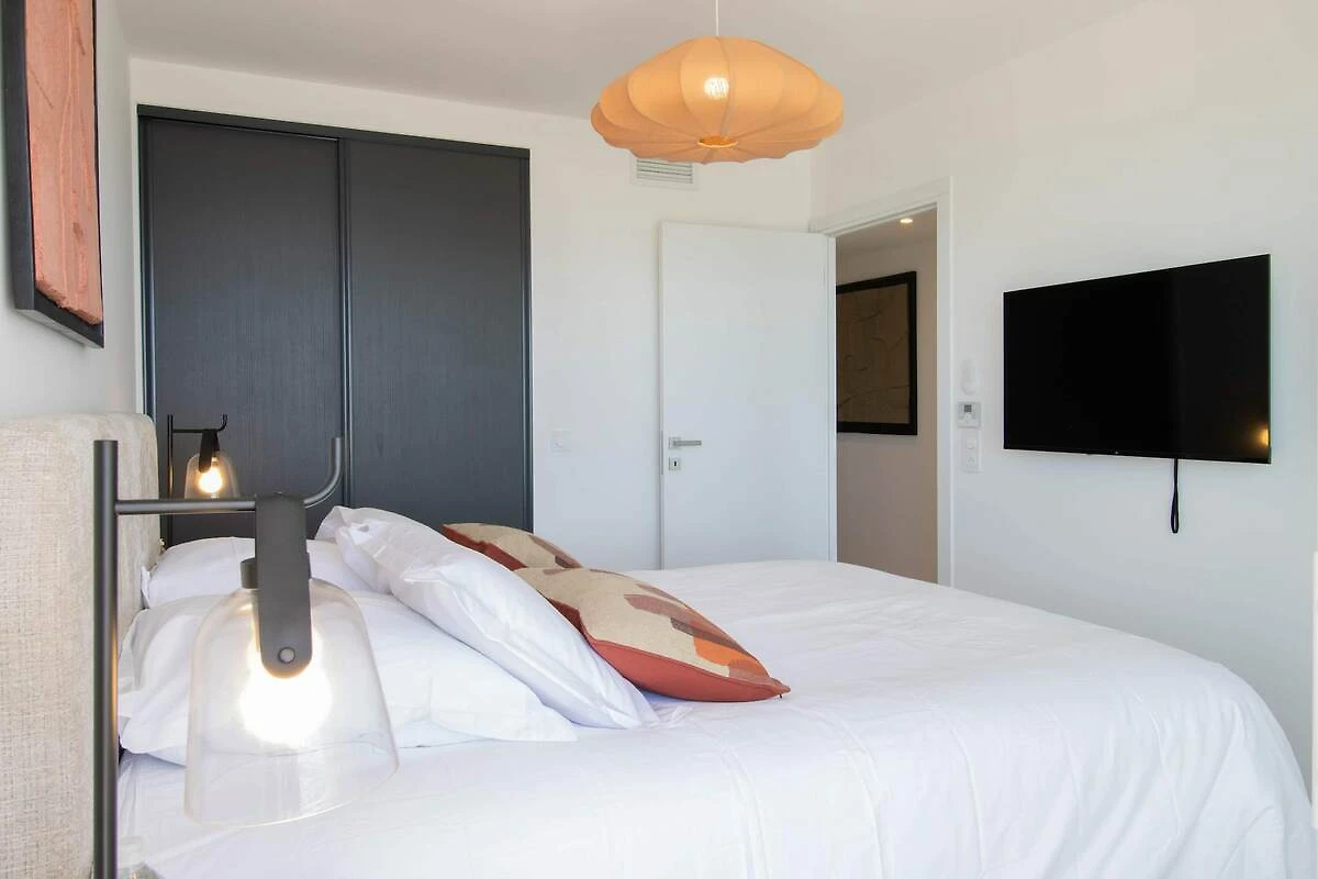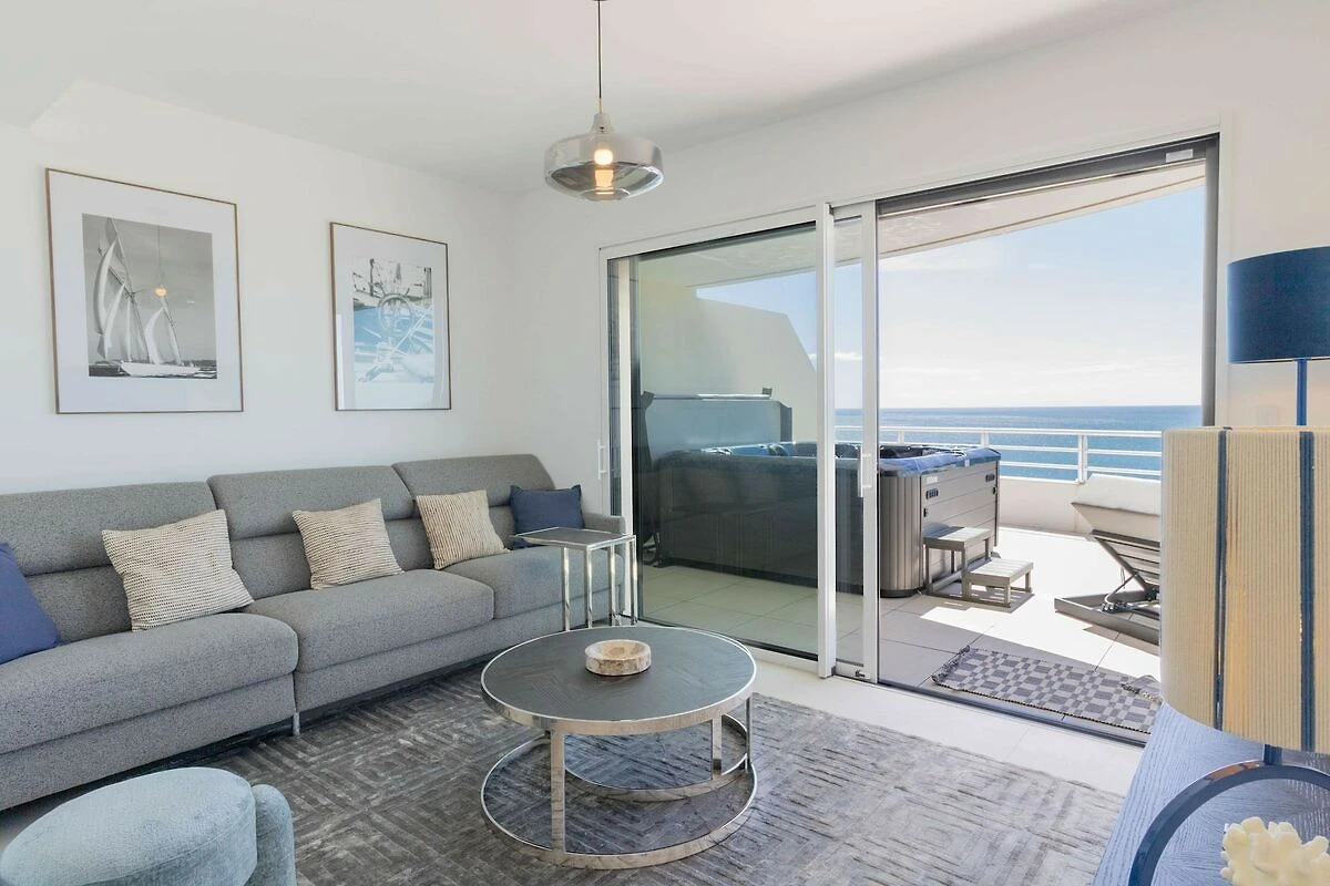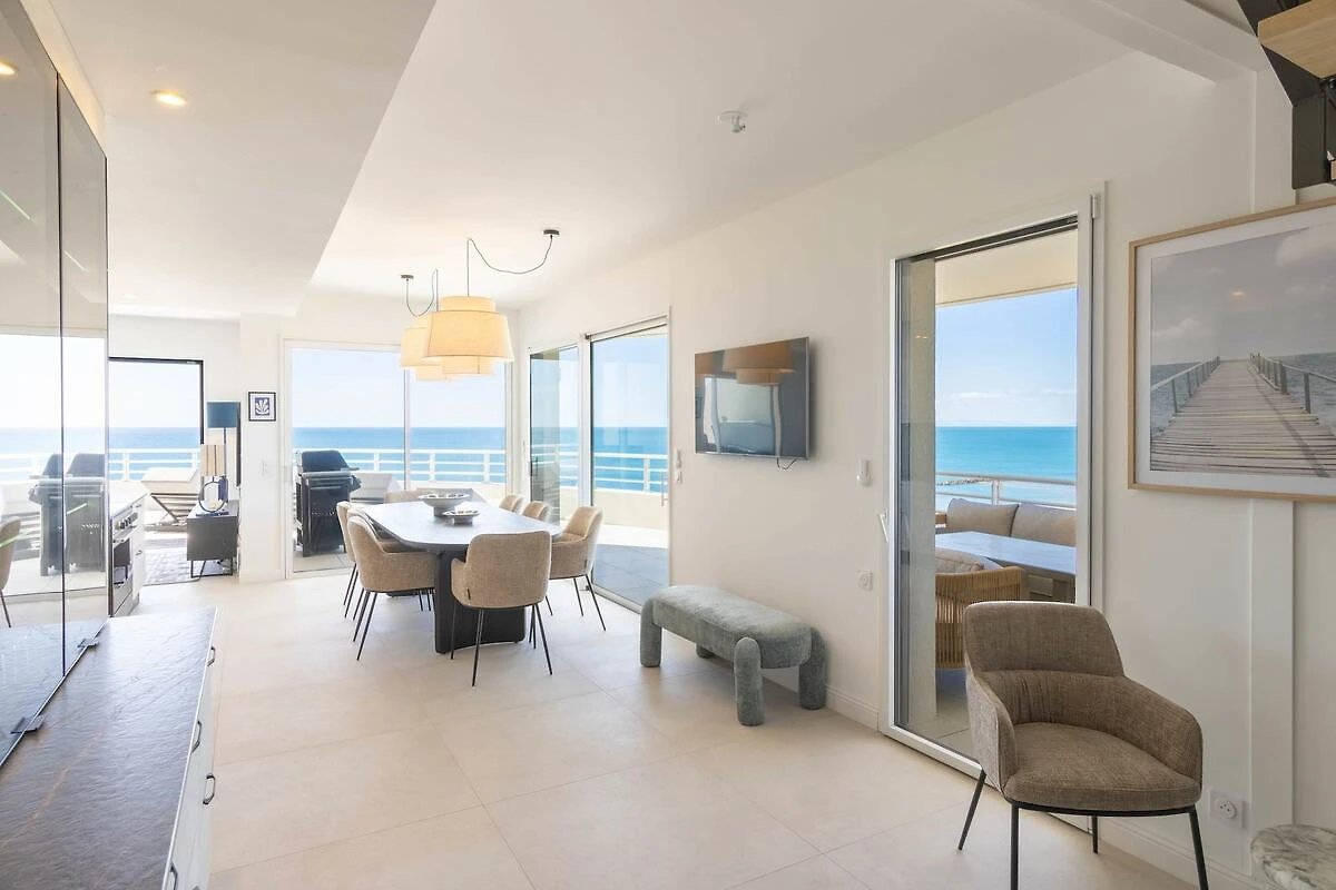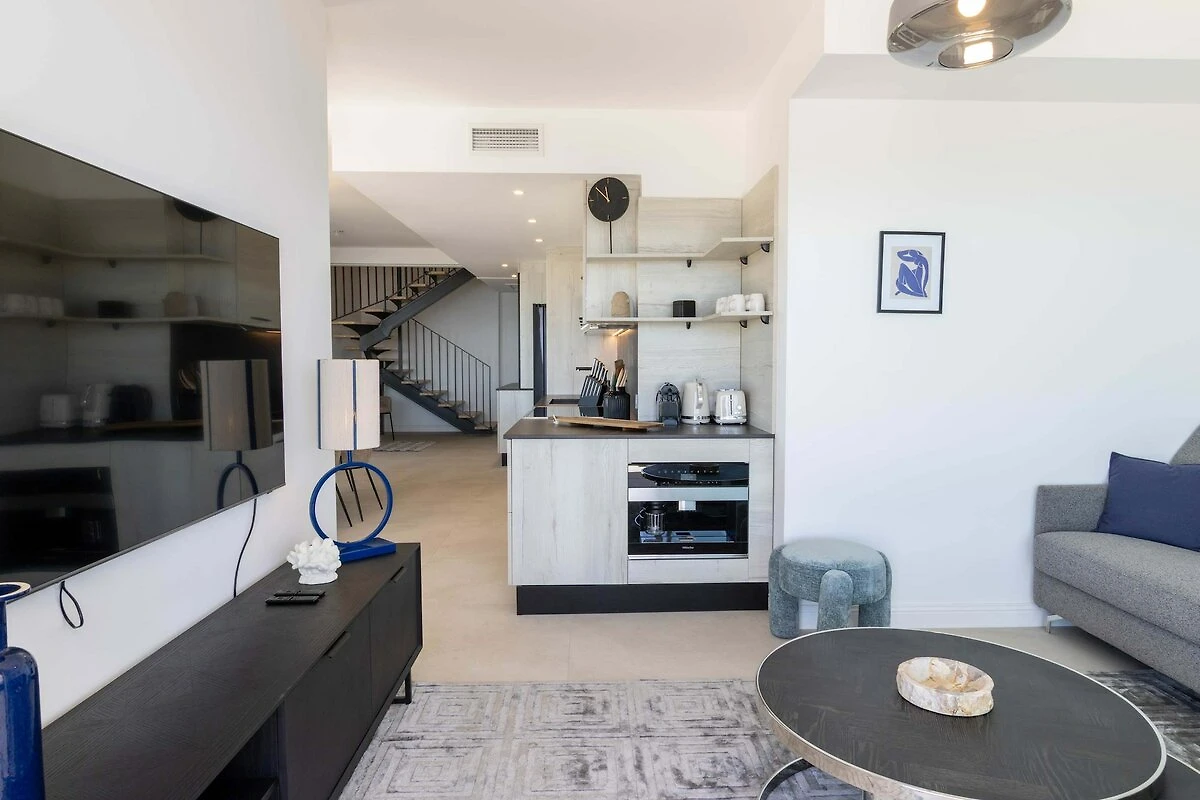 Das Duplex verfügt über drei Schlafzimmer, zwei moderne Badezimmer mit ebenerdigen Duschen und drei WCs. Die Hauptebene umfasst einen offenen Wohn- und Essbereich, eine voll ausgestattete Küche mit Smeg-Geräten sowie eine Terrasse mit Sonnenliegen, einem Loungebereich und einem Bluetooth-Spa. Im Obergeschoss haben alle Schlafzimmer einen Balkon mit Meerblick, während ein zweites Wohnzimmer mit einem 160 cm breiten Schlafsofa zusätzlichen Schlafplatz bietet. Freuen Sie sich auf erstklassige Annehmlichkeiten wie Waschmaschine, Trockner, Nespresso-Maschine, Raclette-Set, Brettspiele und hochwertige Hotelbettwäsche.