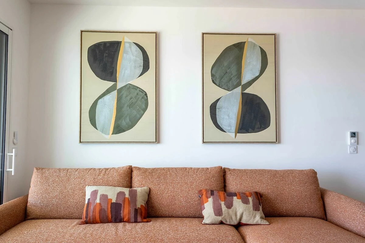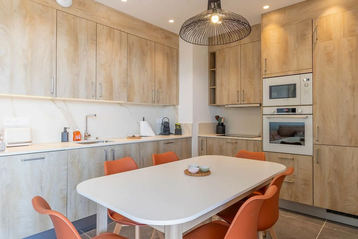 Das lichtdurchflutete Apartment ist komplett ausgestattet für einen angenehmen Aufenthalt. Beide Schlafzimmer verfügen über Balkone und bequeme Doppelbetten. Ein zusätzliches Einzelbett und ein Schlafsofa ermöglichen flexible Schlafmöglichkeiten. Die moderne offene Küche ist mit Geräten von Smeg, einer Nespresso-Maschine und allen wichtigen Utensilien ausgestattet. Highspeed-WLAN, Klimaanlage und eine durchdachte Raumaufteilung sorgen für ganzjährigen Komfort.