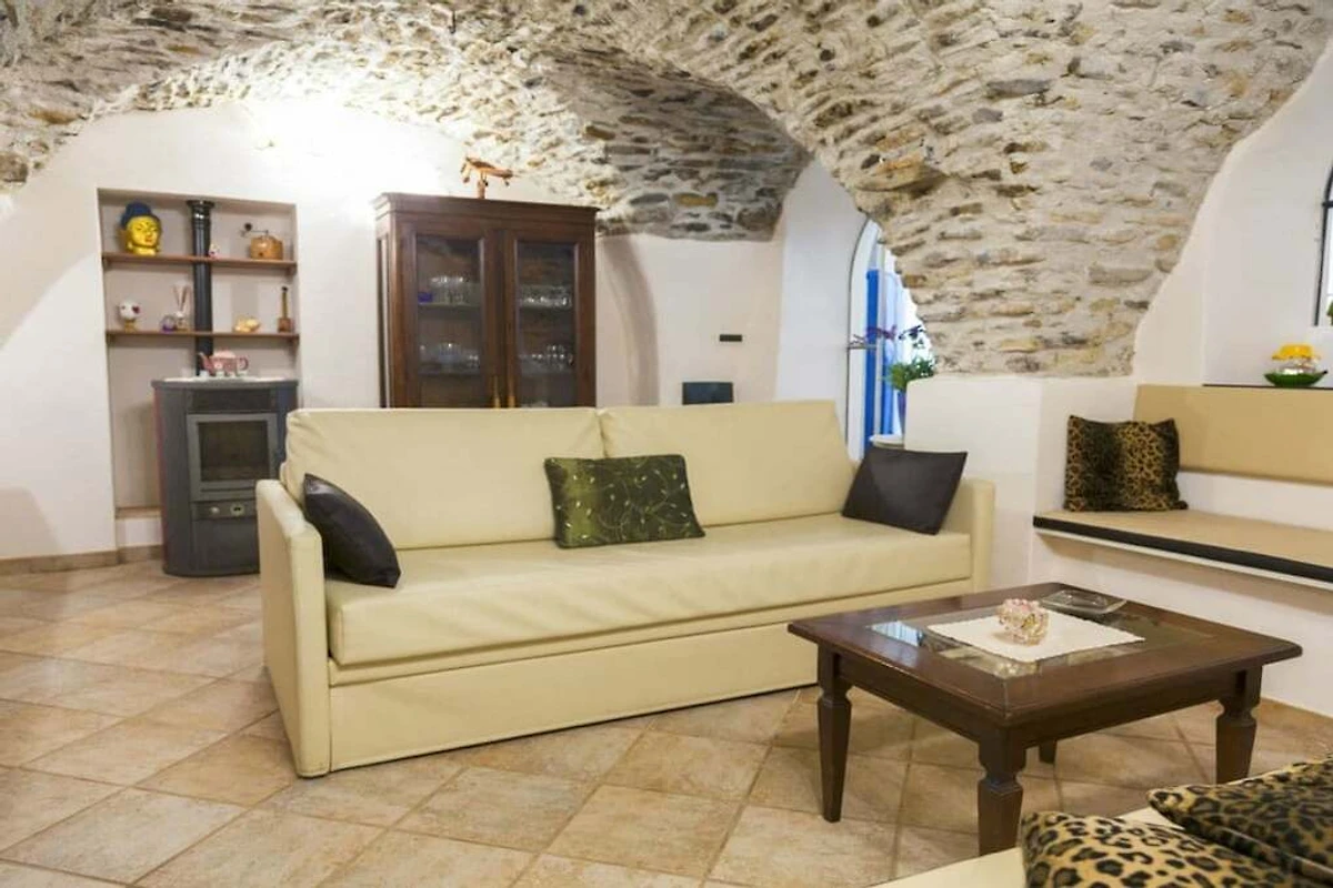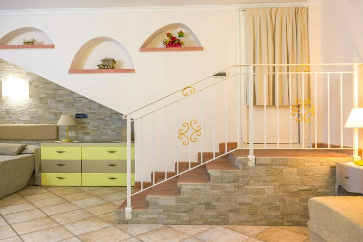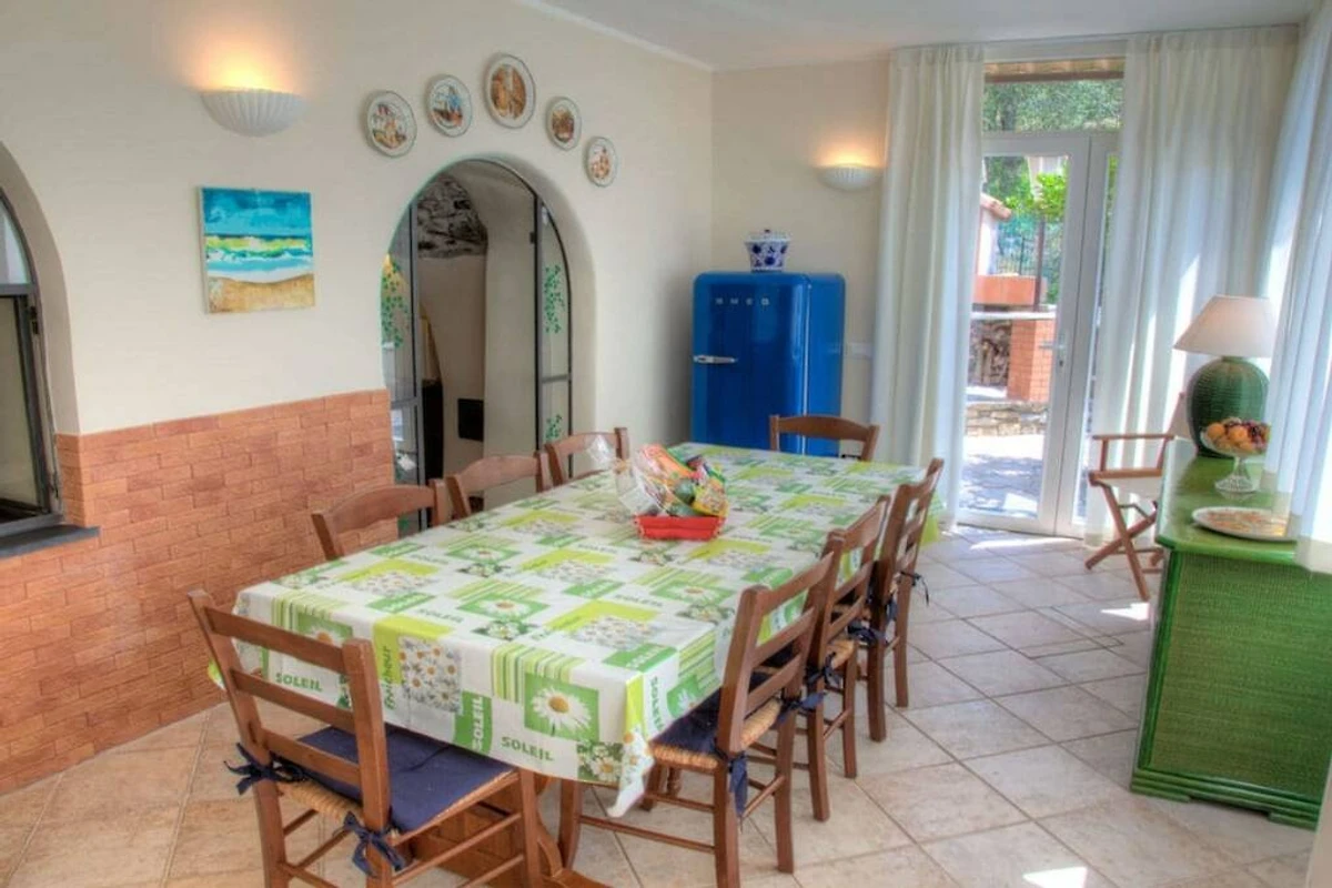 Im Erdgeschoss gibt es ein geräumiges Wohnzimmer mit Sat-TV, einen guten Sitz und Bänke. Angrenzend an die Küche ist es geschmackvoll im italienischen Stil eingerichtet, aber mit allen Einrichtungen ausgestattet wie z.B. mit Geschirrspülmaschine, Kühlschrank, Gefrierschrank, Mikrowelle, Backofen, Kaffeemaschine, Besteck. Sie können eine Waschmaschine nutzen. Es gibt auch ein Doppelzimmer, ein Bad mit Badewanne, Dusche und WC.