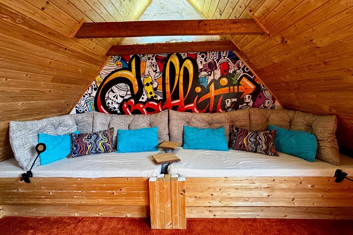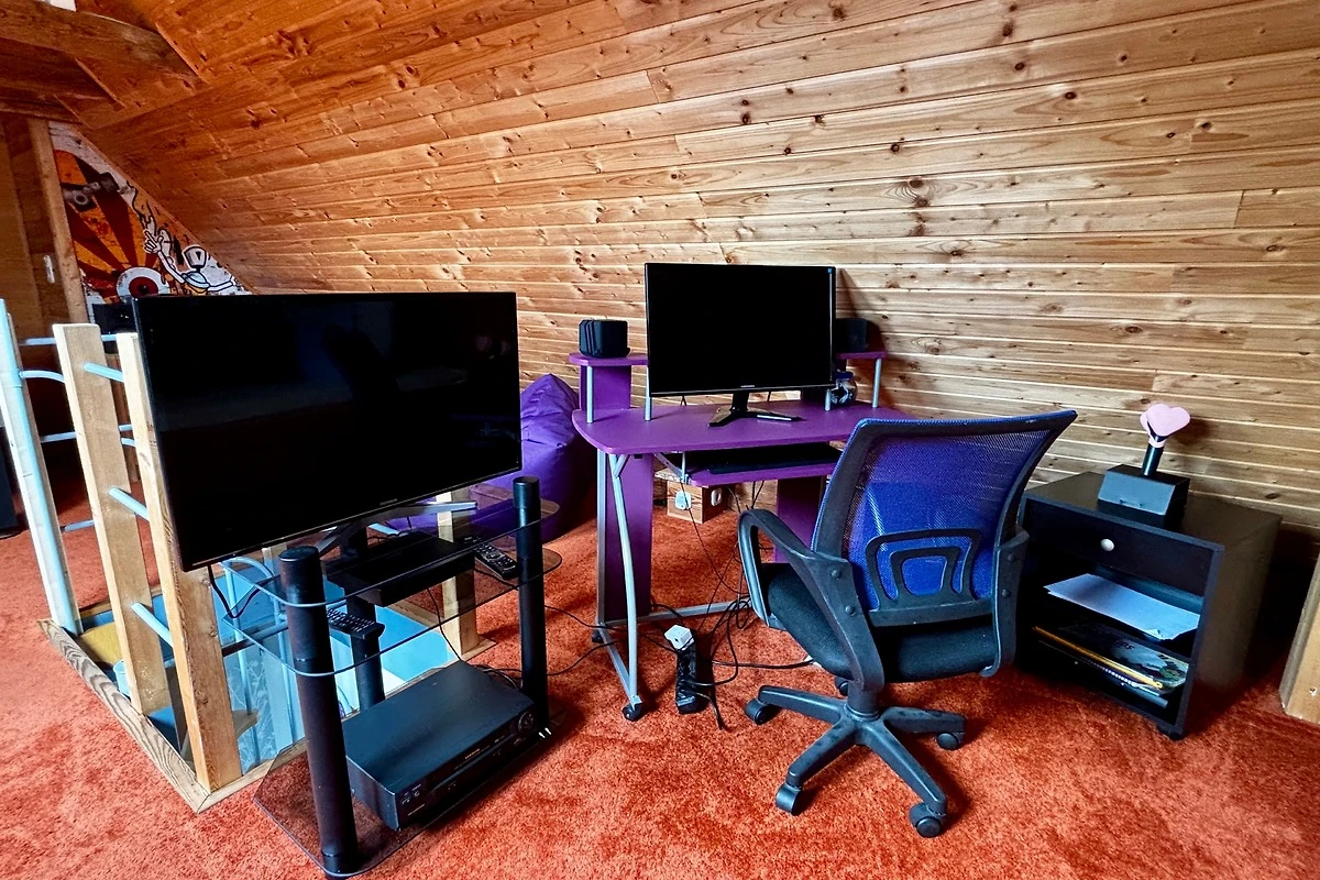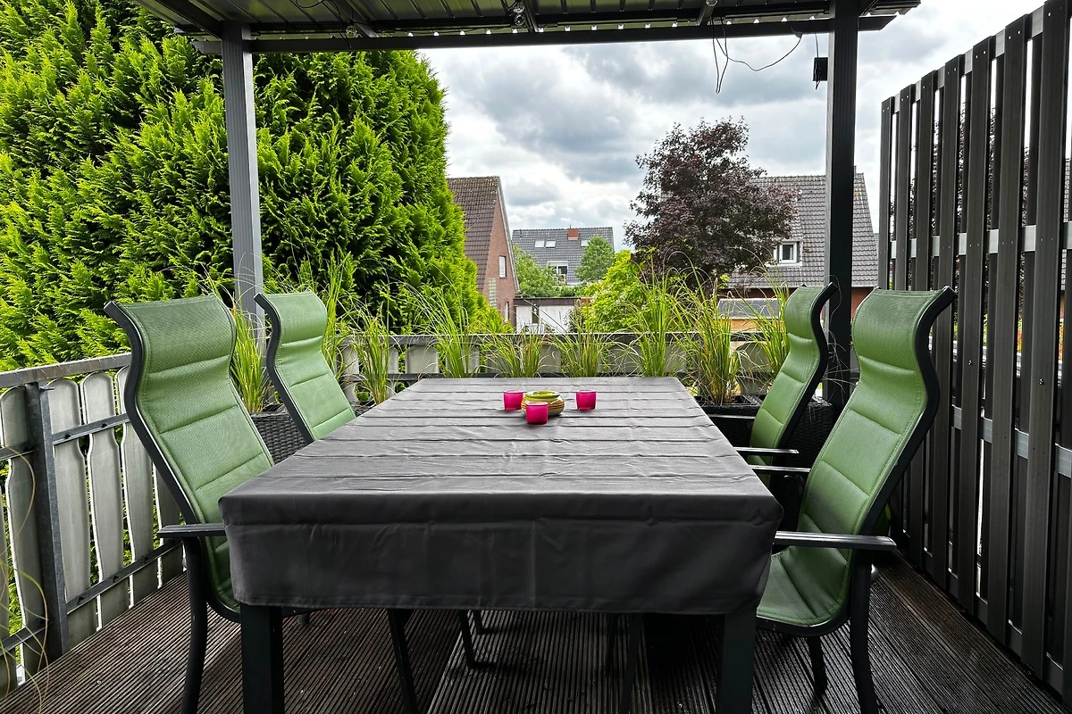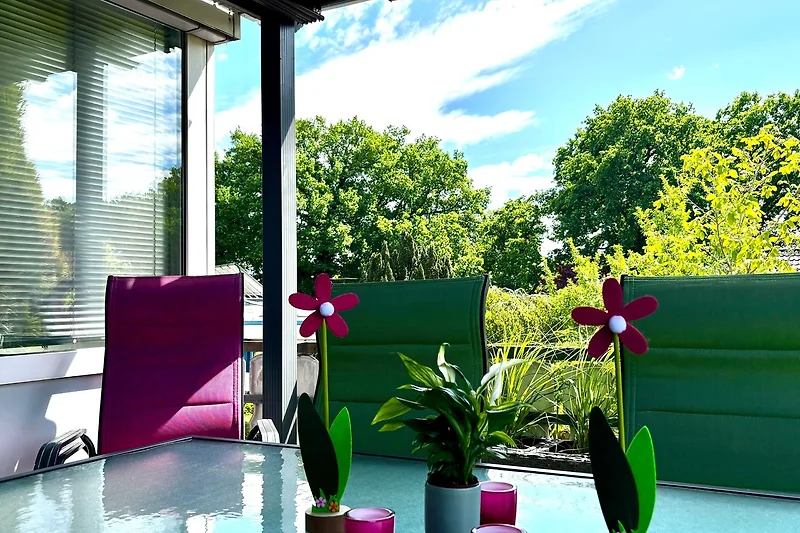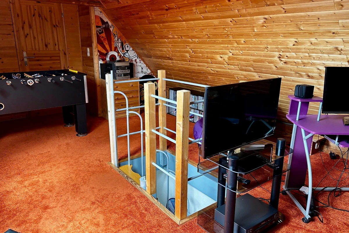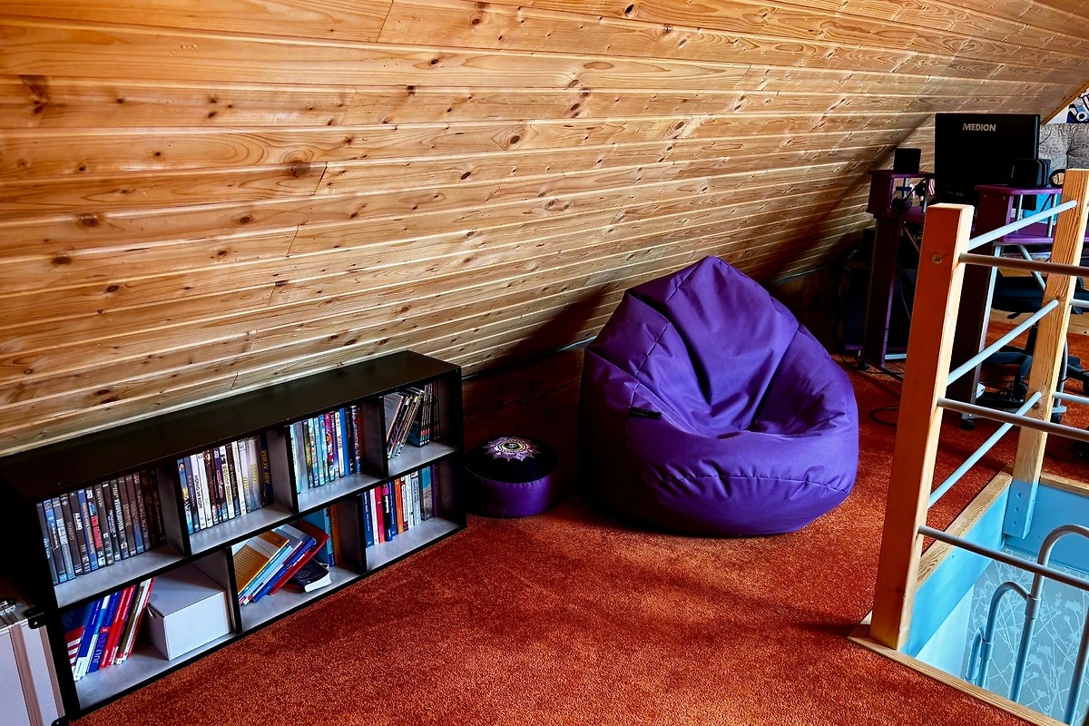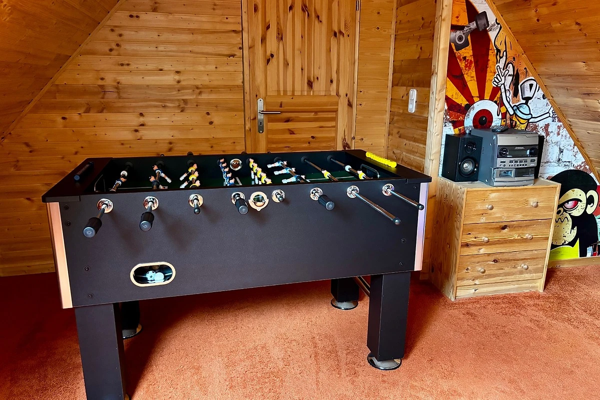 Sollte das Wetter mal nicht mitspielen, lädt die überdachte Dachterrasse zum Verweilen ein. Ein Wintergarten mit schönem Blick in die Bäume und einem Elektrokamin für gemütliche Abendstunden. Eine grosse Anzahl von Spielen steht Ihnen zur Verfügung, ausserdem eine Wii mit vielen Spielen. Im Dachgeschoss (Studio) befindet sich der beliebte Kicker (Tischfussball), eine Leseecke, viele DVD´s und CD´s. Möchten Sie selber Musik machen, nutzen Sie gerne das Keyboard oder die Gitarre.