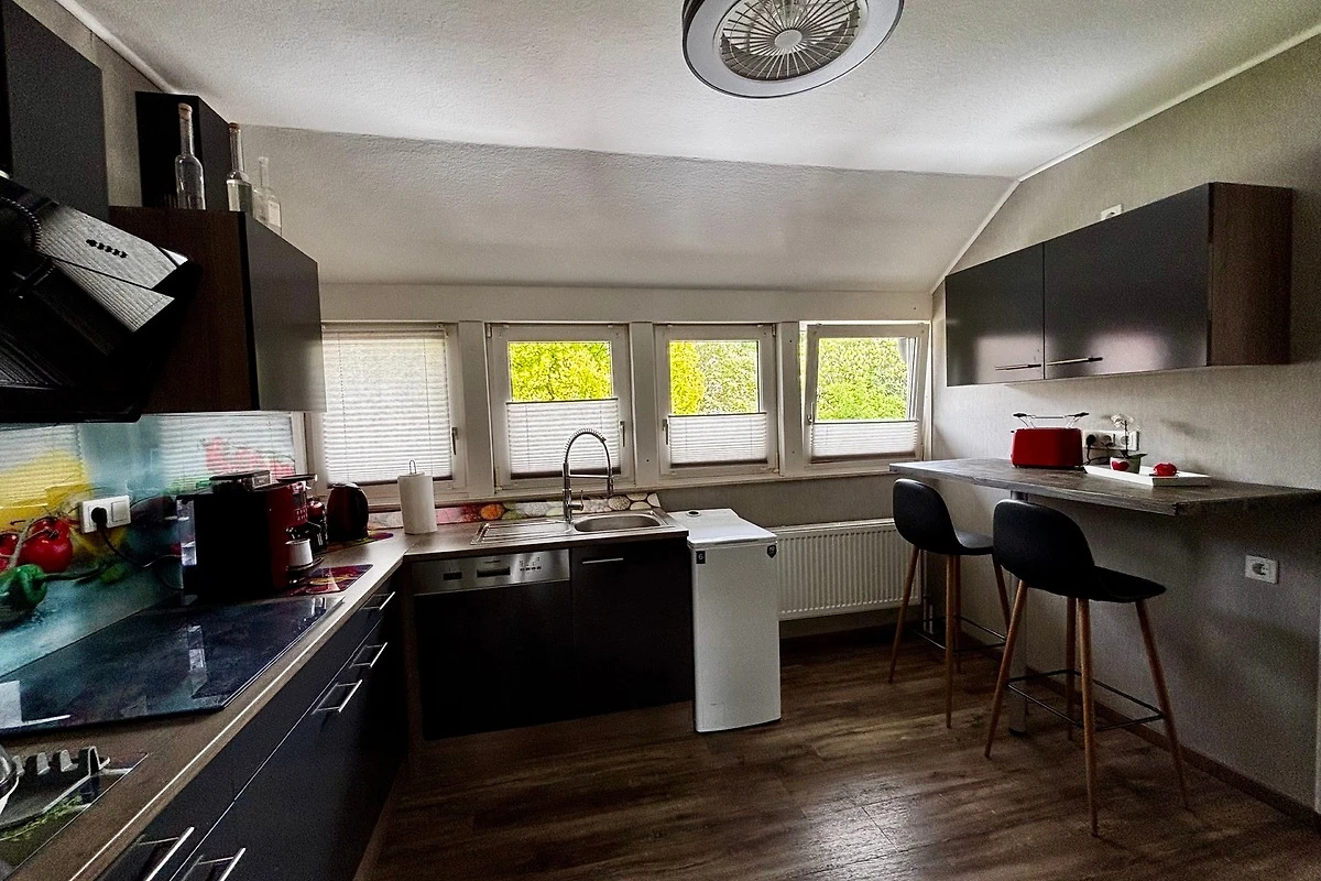 Backofen, Ceranfeld, Mikrowelle, Kühlschrank mit Gefrierfach, Spülmaschine, Kaffeevollautomat mit Mahlwerk, elektr. Milchaufschäumer, Wasserkocher, Toaster, Eierkocher, Mixer, Heissluftfriteuse, Fondue, Raclette und vieles mehr was benötigt wird.