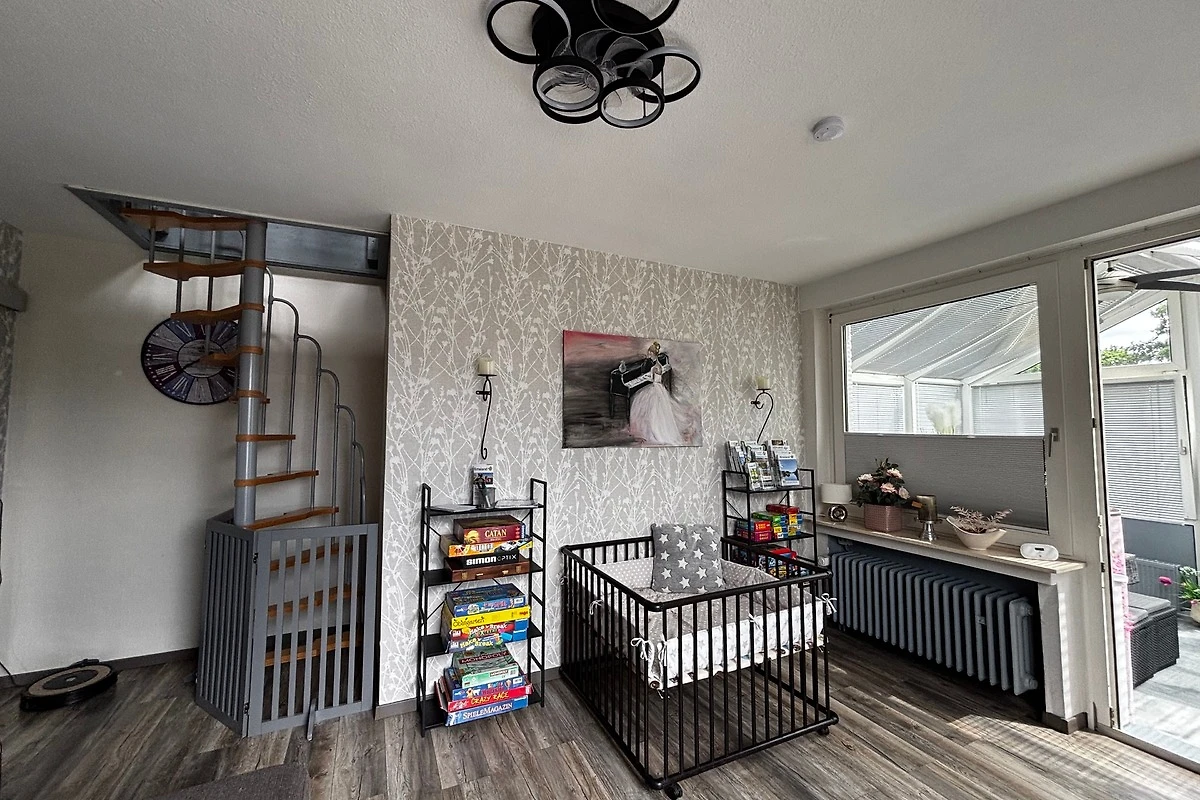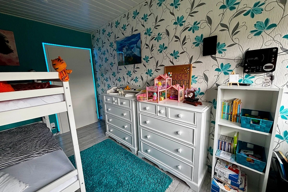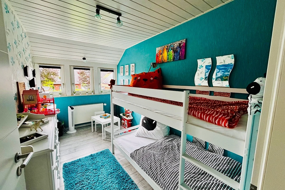 Ein Elternschlafzimmer mit Babybett, Wickelkommode und Schaukelstuhl, ein liebevoll eingerichtetes Kinderzimmer mit Etagenbett (2 Betten) und Spieleecke. Ein Studio für 2 Teenies zum Schlafen und Chillen. Selbstverständlich mit freiem WLAN und einem Parkplatz direkt vor der Tür.