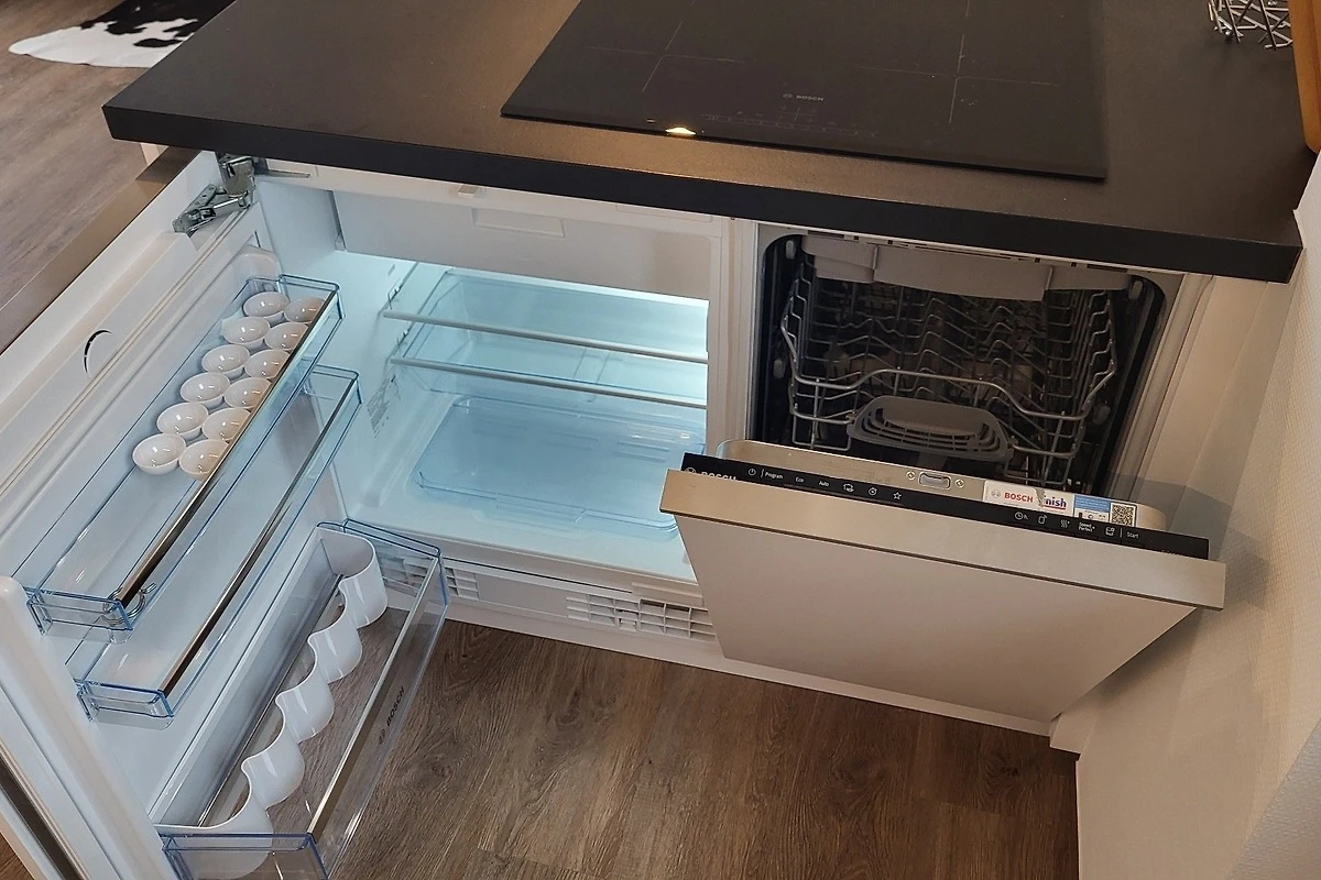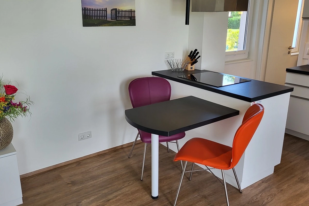 Die offene Küche ist mit allem ausgestattet, was Sie zum zubereiten Ihrer Speisen benötigen. Induktionskochfeld, Dunstabzugshaube, Kombi-Grillofen/ Mikrowelle, Kühlschrank mit Gefrierfach, Geschirrspüler und viele kleine und grosse Küchenhelfer stehen Ihren Kochkünsten zur Verfügung.