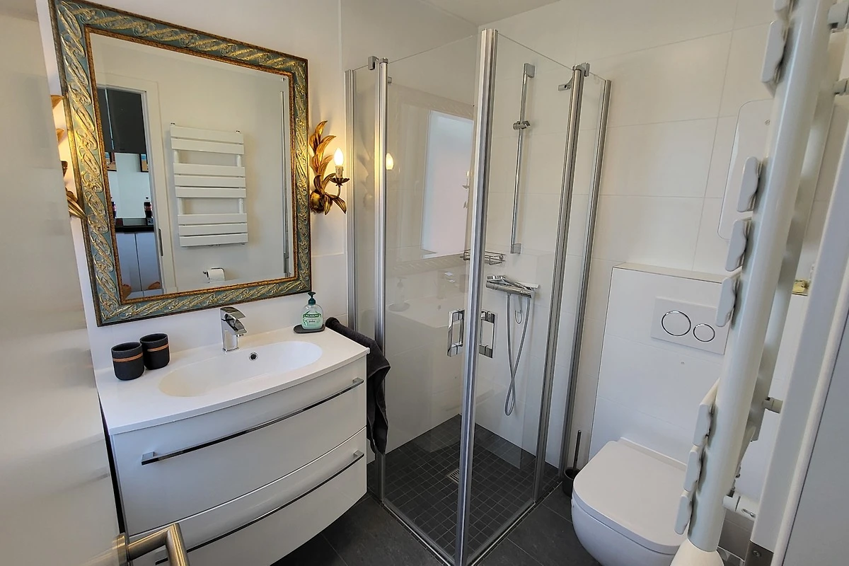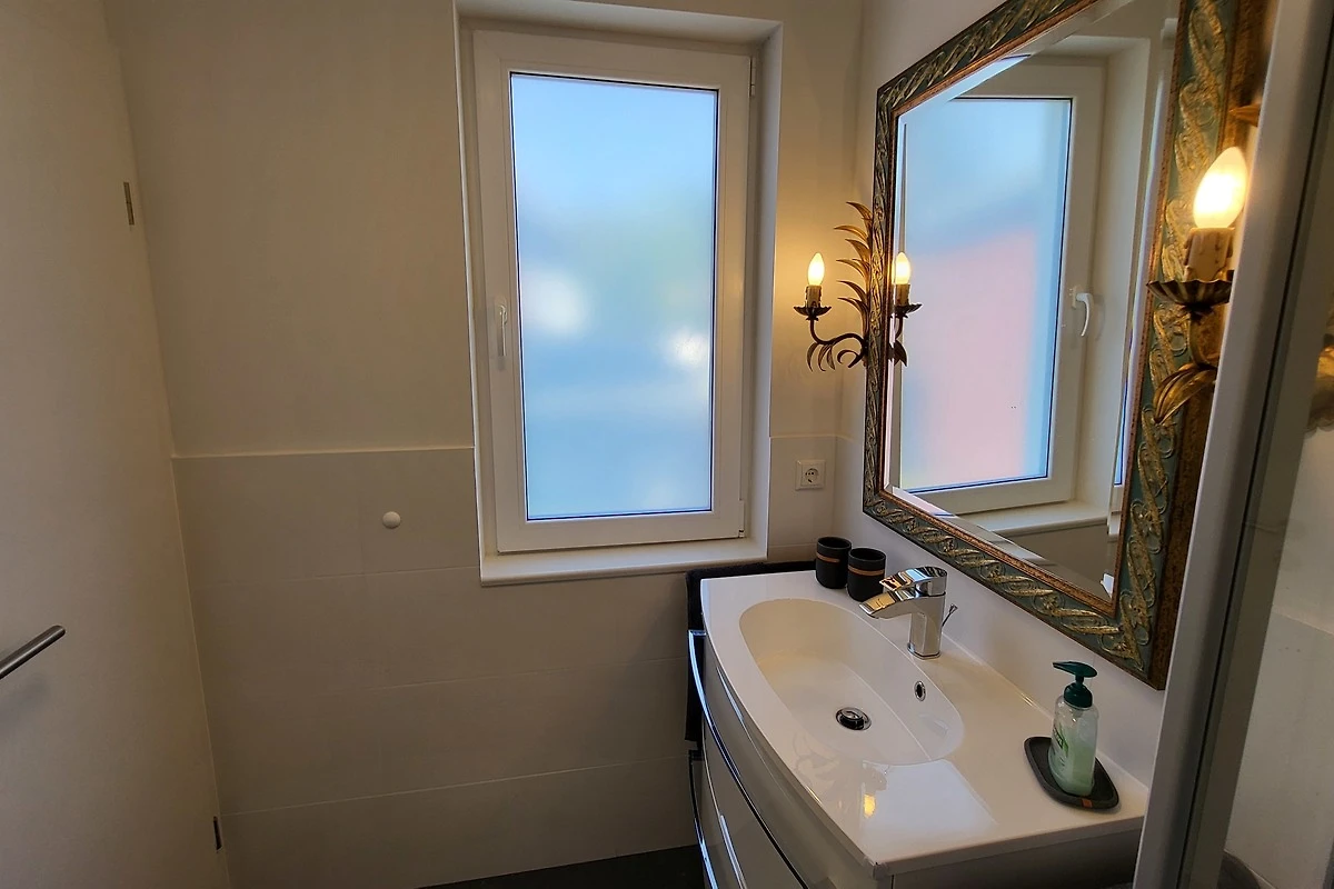 Das geflieste Tageslichtbad verfügt über eine geräumige barrierefreie Dusche, Waschtisch und WC. Unter dem Waschtisch finden Sie genügend Stauraum. Hier finden Sie auch einen Haartrockner.