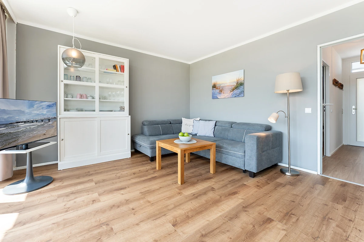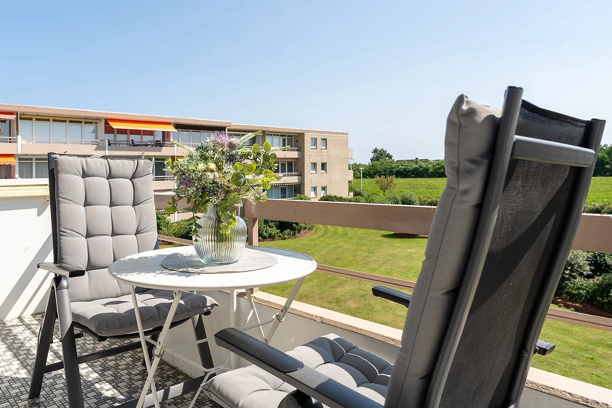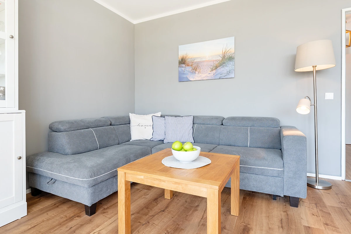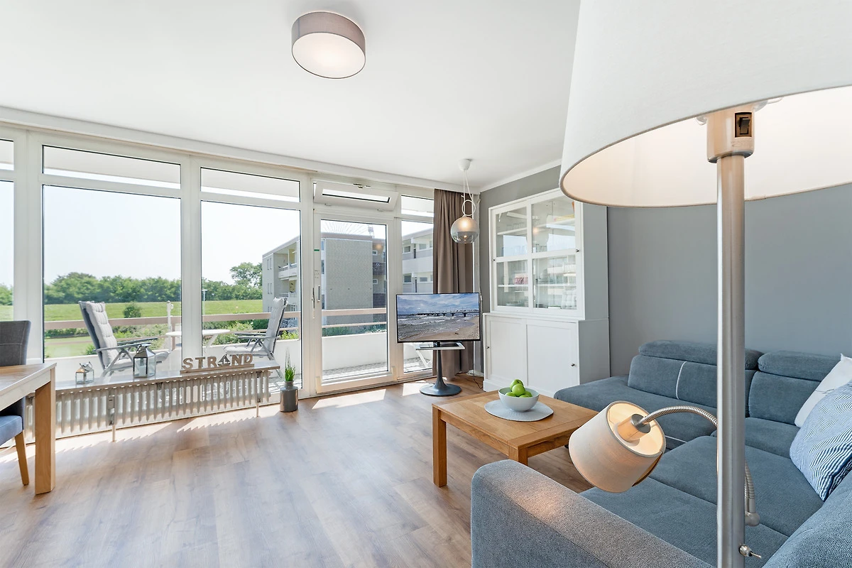 Diese charmante Wohnung liegt in einem strandnahen Appartementhaus und überzeugt durch ihre durchdachte Ausstattung. Im hellen Wohnbereich erwartet Sie ein gemütliches Sofa sowie moderne Unterhaltung über SAT-TV. Der angrenzende Balkon lädt zum Verweilen in der Sonne ein. Die separate Küchenzeile ist mit einem Mikro-Backkombigerät, 2 Cerankochfeldern, Kühlschrank, Geschirrspüler und Kaffeemaschine voll ausgestattet. Das Schlafzimmer bietet ein komfortables Boxspringbett (160x200) für entspannte Stunden. Das moderne Bad ist mit Dusche und WC ausgestattet.