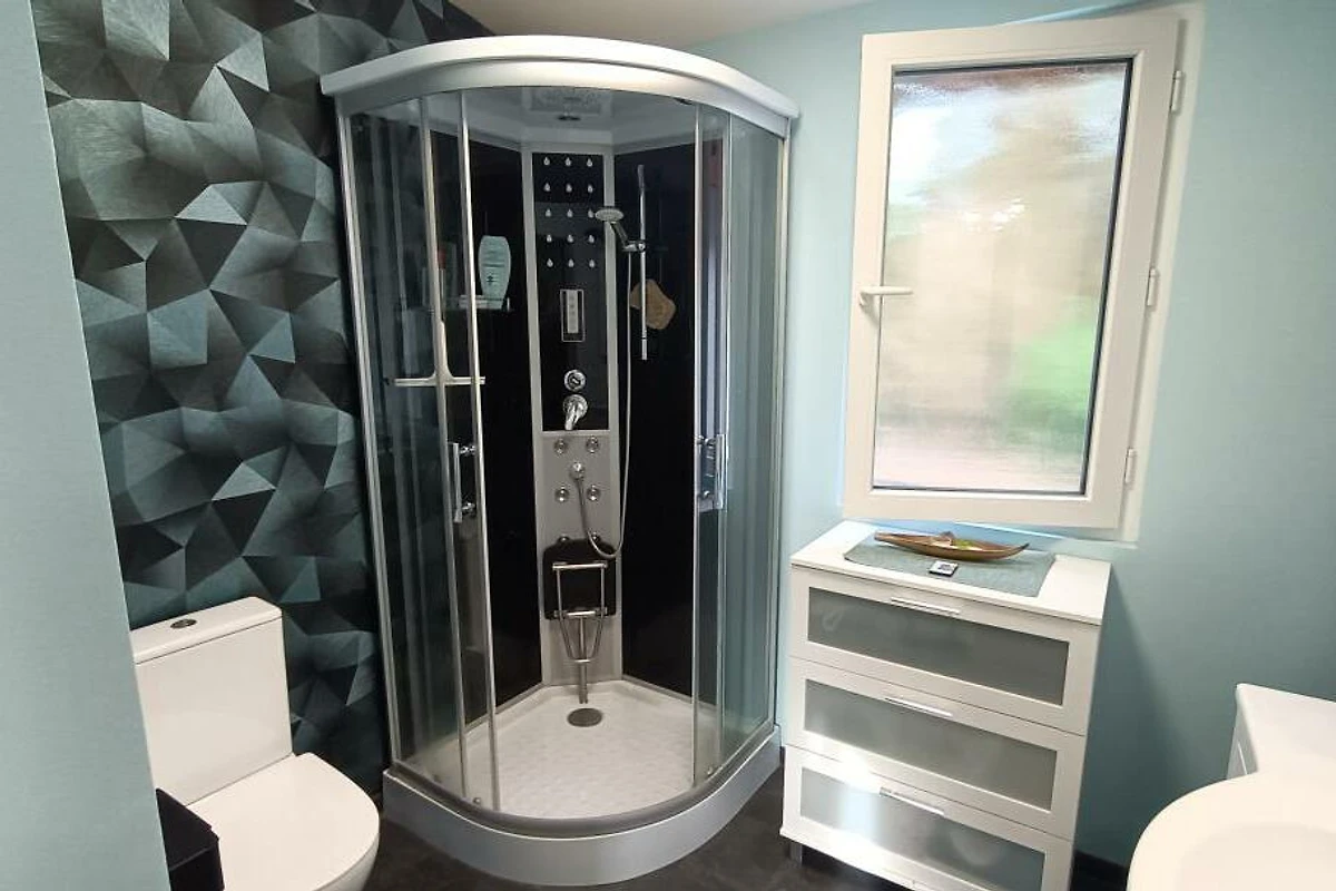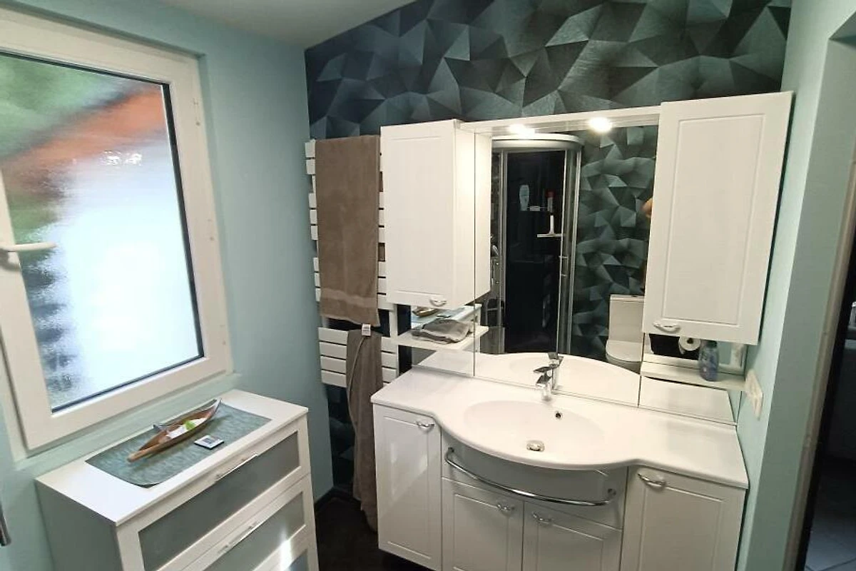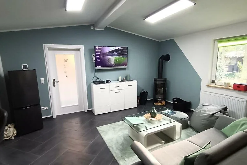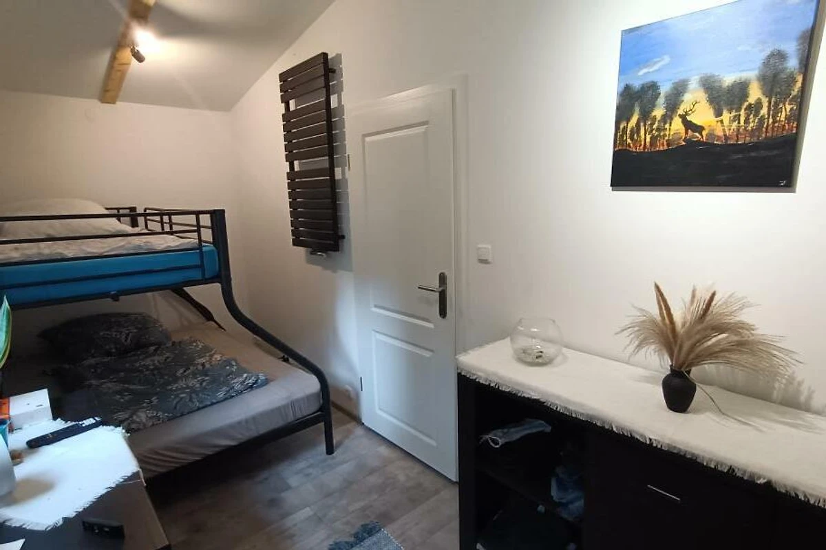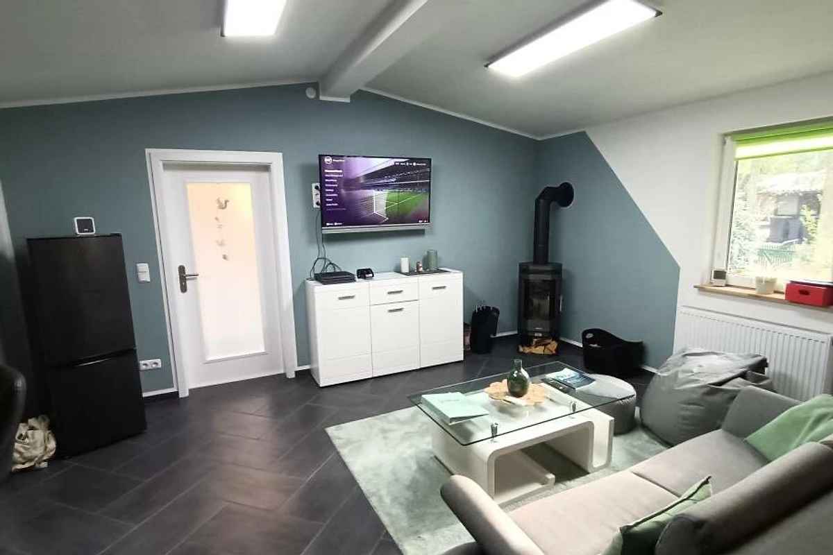 Ausstattung: Schlafzimmer mit Etagenbett (oben 90×200 cm, unten 140×200 cm), abtrennbarer Schlafbereich im Wohnraum mit Futonbett (140×200 cm), voll ausgestattete Küche, modernes Bad mit Regendusche und Massagefunktion, gemütlicher Wohnbereich mit Smart-TV, WLAN und Kamin.
