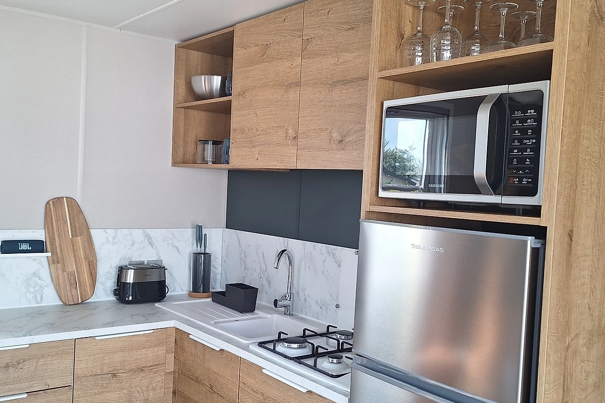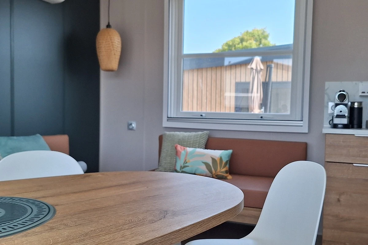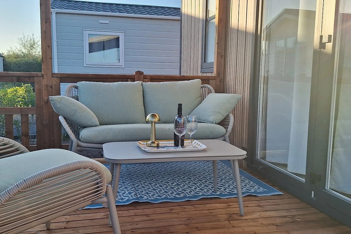 Das Chalet ist im modernen skandinavischen Stil eingerichtet. Natürliche Farbtöne sorgen für eine entspannte Atmosphäre. Nur wenige Schritte hinter den Dünen hören Sie das Rauschen des Meeres – und mitunter sogar das Wiehern von Pferden.