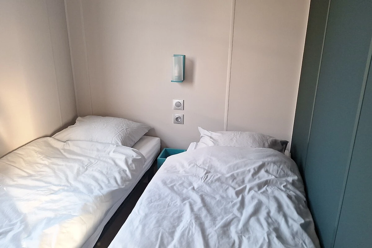 Drei stimmungsvoll eingerichtete Schlafzimmer bieten Platz für bis zu sechs Personen (vier Erwachsene und zwei Kinder). Im Hauptschlafzimmer steht ein Doppelbett (160 × 200 cm), im zweiten Schlafzimmer zwei Einzelbetten, und im Kinderzimmer ein Etagenbett.