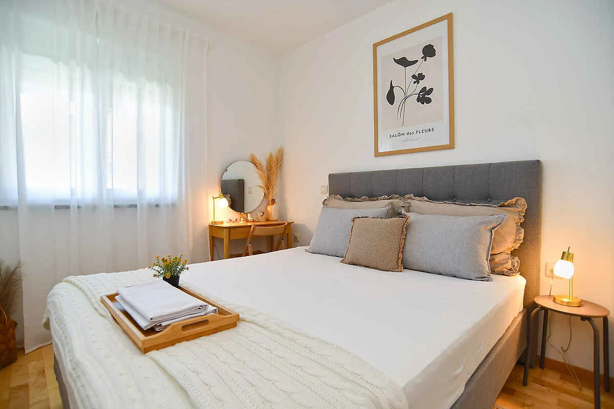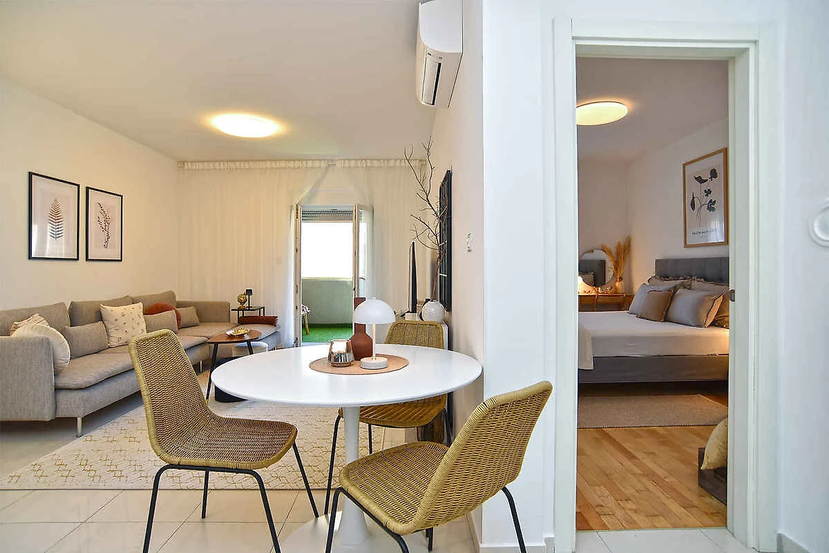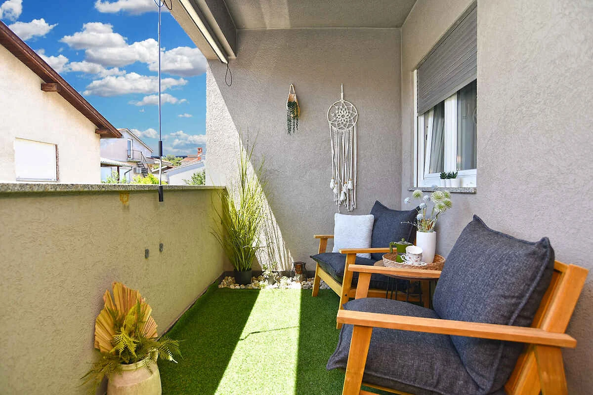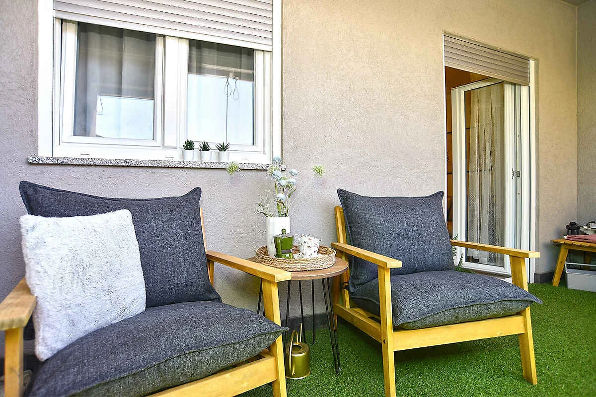 Wohnzimmer (15 qm) mit 1 Zusatzbett auf Couch/Sofa, Sitzecke, TV und Zugang zum Balkon (8 qm, überdacht, Gartenmöbel, 2 Stühle). Schlafzimmer (11 qm) mit 1 Doppelbett. Kochecke in der Wohnküche (11 qm) mit Essecke (3 Plätze), Elektroherd (4 Platten), Backofen, Geschirrspüler, Kühlschrank (Eisfach), Mikrowelle, Kaffeemaschine und elektrischem Wasserkocher. Bad (5 qm) mit Waschmaschine, Dusche, 1 Waschbecken, WC und Föhn.