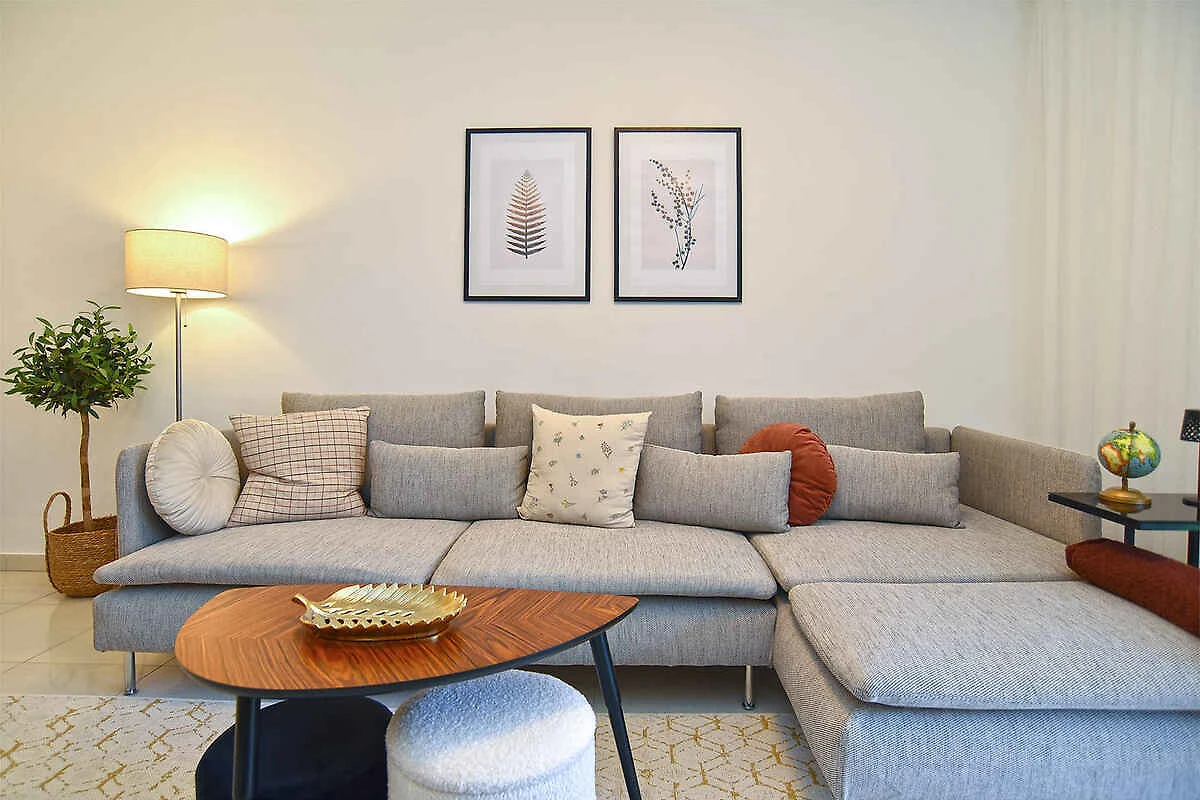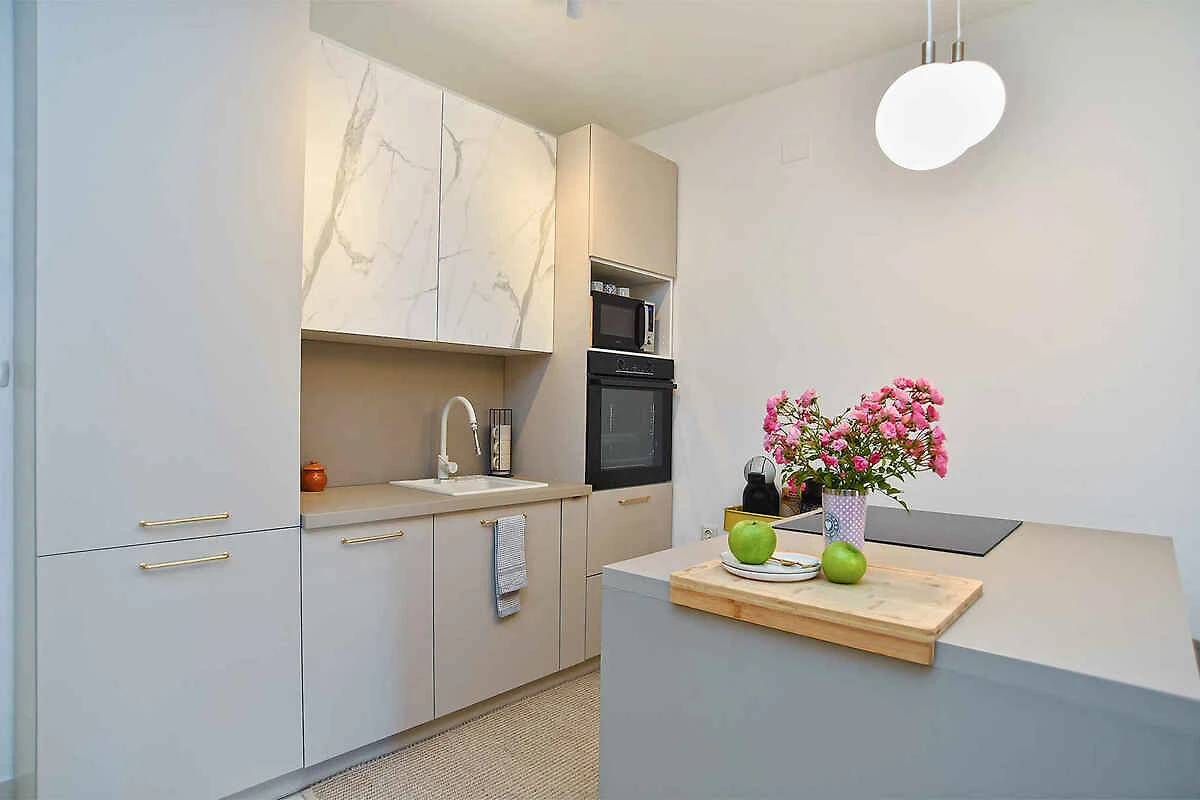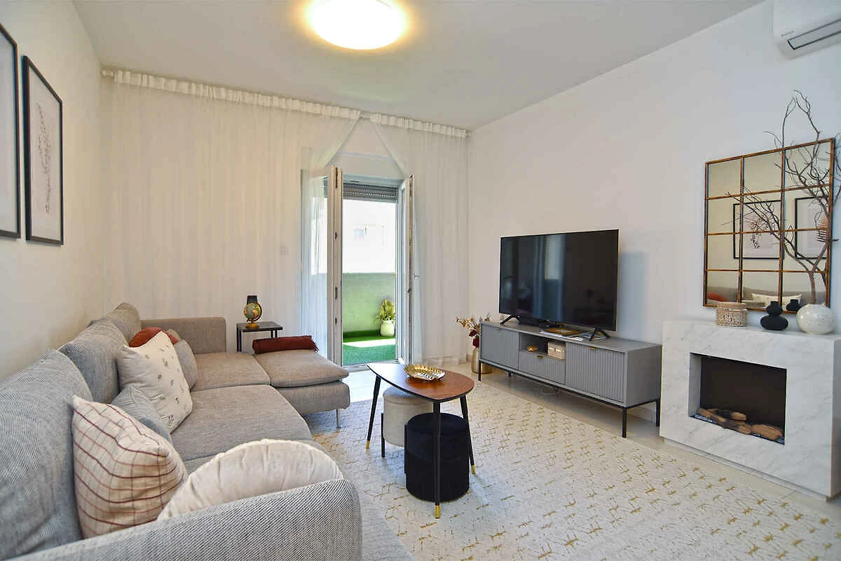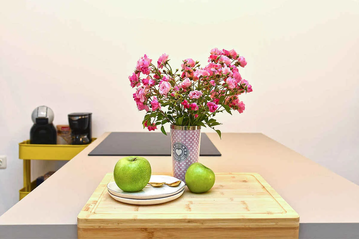 Wohnzimmer (15 qm) mit 1 Zusatzbett auf Couch/Sofa, Sitzecke, TV und Zugang zum Balkon (8 qm, überdacht, Gartenmöbel, 2 Stühle). Schlafzimmer (11 qm) mit 1 Doppelbett. Kochecke in der Wohnküche (11 qm) mit Essecke (3 Plätze), Elektroherd (4 Platten), Backofen, Geschirrspüler, Kühlschrank (Eisfach), Mikrowelle, Kaffeemaschine und elektrischem Wasserkocher. Bad (5 qm) mit Waschmaschine, Dusche, 1 Waschbecken, WC und Föhn.