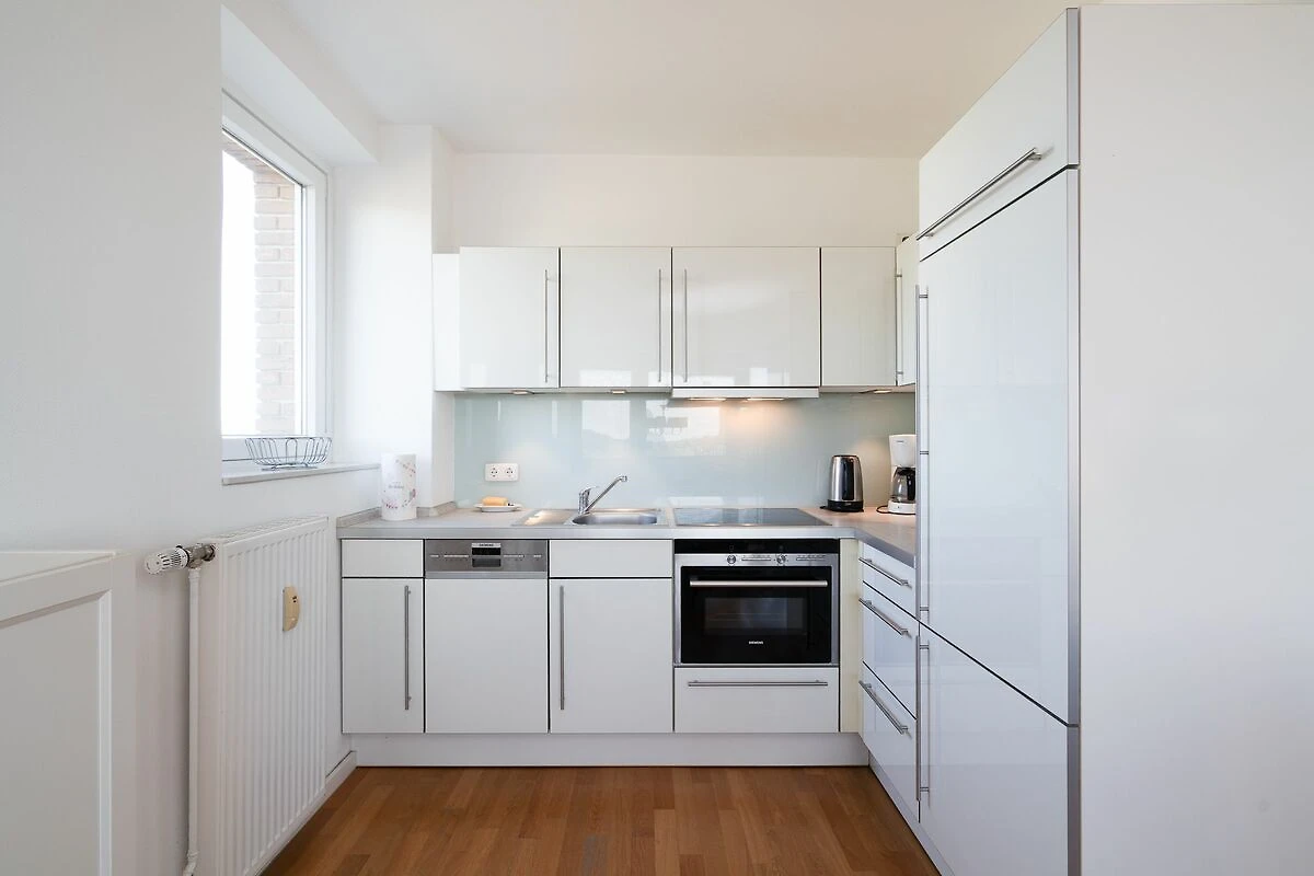 Die offen zum Wohnzimmer gestaltete Küche ist mit Backofen und Herd ausgestattet, sowie umfangreichen Küchenutensilien wie Kaffeemaschine, Wasserkocher, Toaster sowie Geschirr und Besteck. Das Badezimmer bietet eine Dusche mit Wanne, Waschbecken, Spiegel und WC.