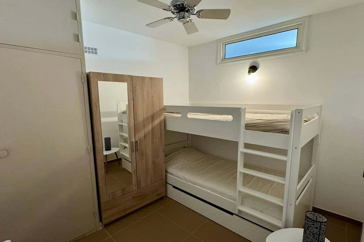 Im Inneren finden Sie zwei gemütliche Schlafzimmer: eines mit Doppelbett und eines mit Etagenbetten – ideal für Kinder. Der Wohn- und Essbereich ist hell und einladend, und die voll ausgestattete Küche bietet alles, was Sie brauchen, einschließlich einer Senseo- und Nespresso-Kaffeemaschine. Das Apartment verfügt außerdem über ein Duschbad mit Waschmaschine und ein separates WC für zusätzlichen Komfort.
