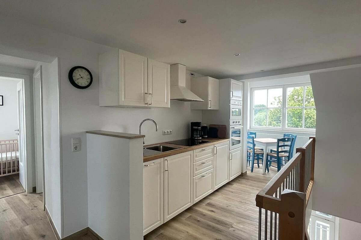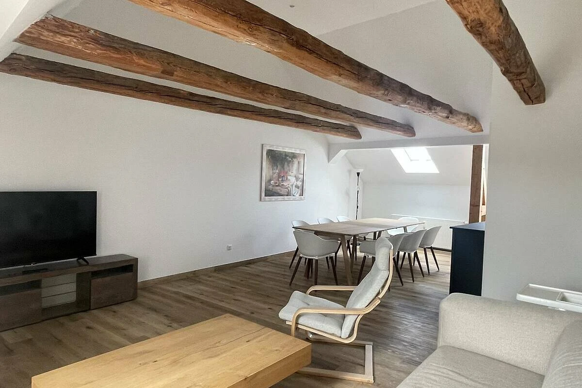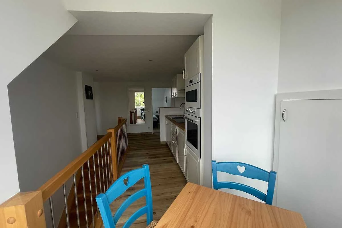 Die voll ausgestattete Küche lässt keine Wünsche offen und verfügt über moderne Geräte wie Geschirrspüler, Mikrowelle, Wasserkocher und eine Kaffeemaschine. Ein großer Esstisch im Wohnbereich lädt zu gemeinsamen Mahlzeiten ein, und das geräumige Wohnzimmer mit bequemen Sofas und Fernseher bietet den idealen Ort zum Entspannen.