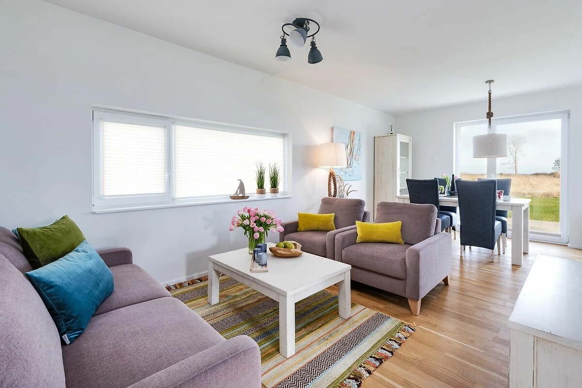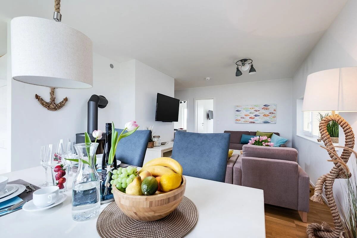 Das Wohnzimmer ist modern und gemütlich eingerichtet und verfügt über ein komfortables Sofa, Sessel, eine Kommode sowie einen Kaminofen, der in der kühleren Jahreszeit für behagliche Wärme sorgt. Zusätzlich trägt eine Fußbodenheizung zu einem angenehmen Raumklima bei. Für Deine Unterhaltung stehen Dir zwei digitale Fernseher sowie kostenfreies WLAN zur Verfügung.