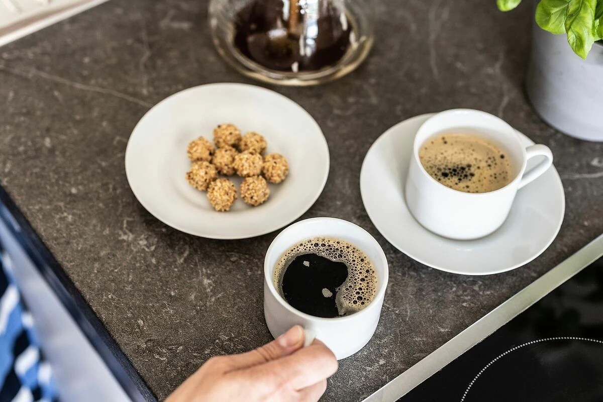 Die modernen Küchen sind voll ausgestattet und verfügen über einen grossen Esstisch, Cerankochfeld, Backofen, Mikrowellenherd, Spülmaschine, Flatscreen TV, Couch und Balkon.
