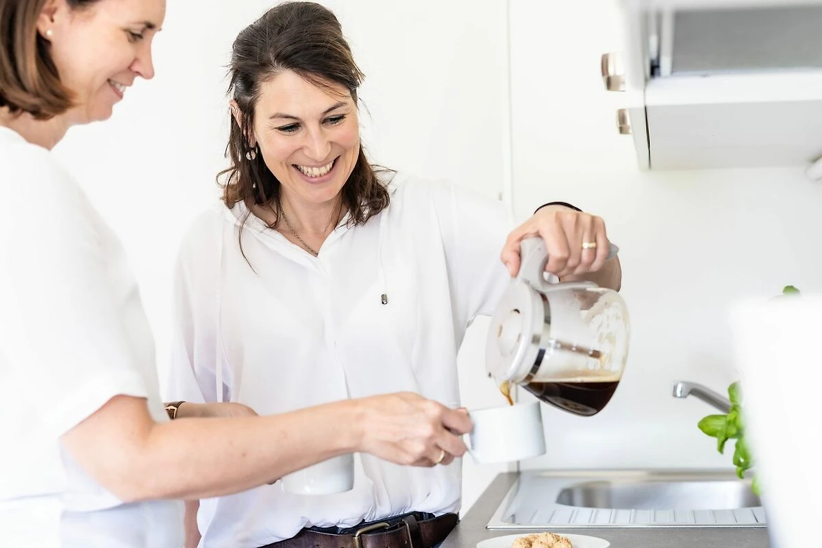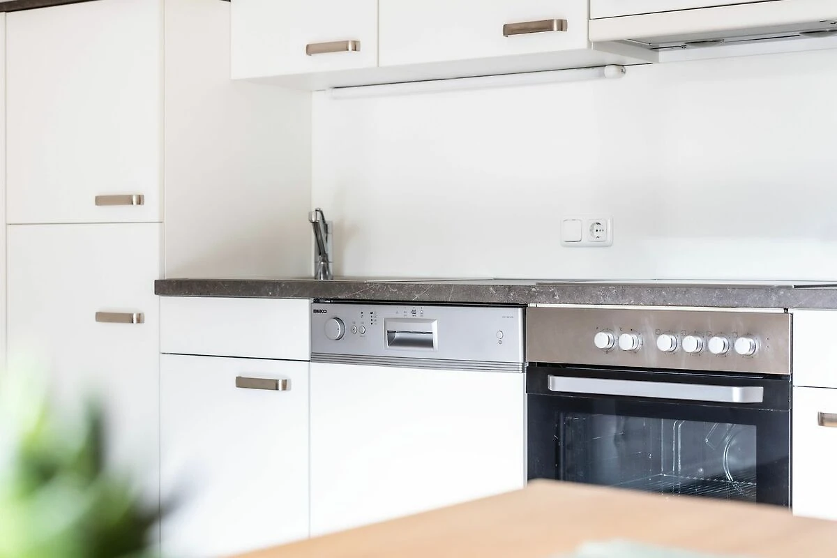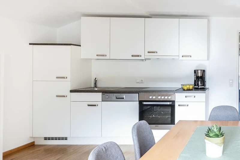 Die modernen Küchen sind voll ausgestattet und verfügen über einen grossen Esstisch, Cerankochfeld, Backofen, Mikrowellenherd, Spülmaschine, Flatscreen TV, Couch und Balkon.