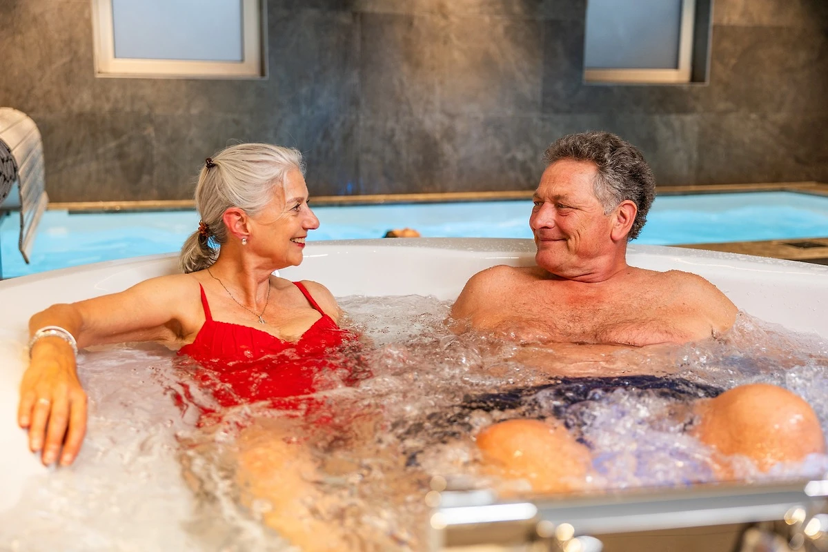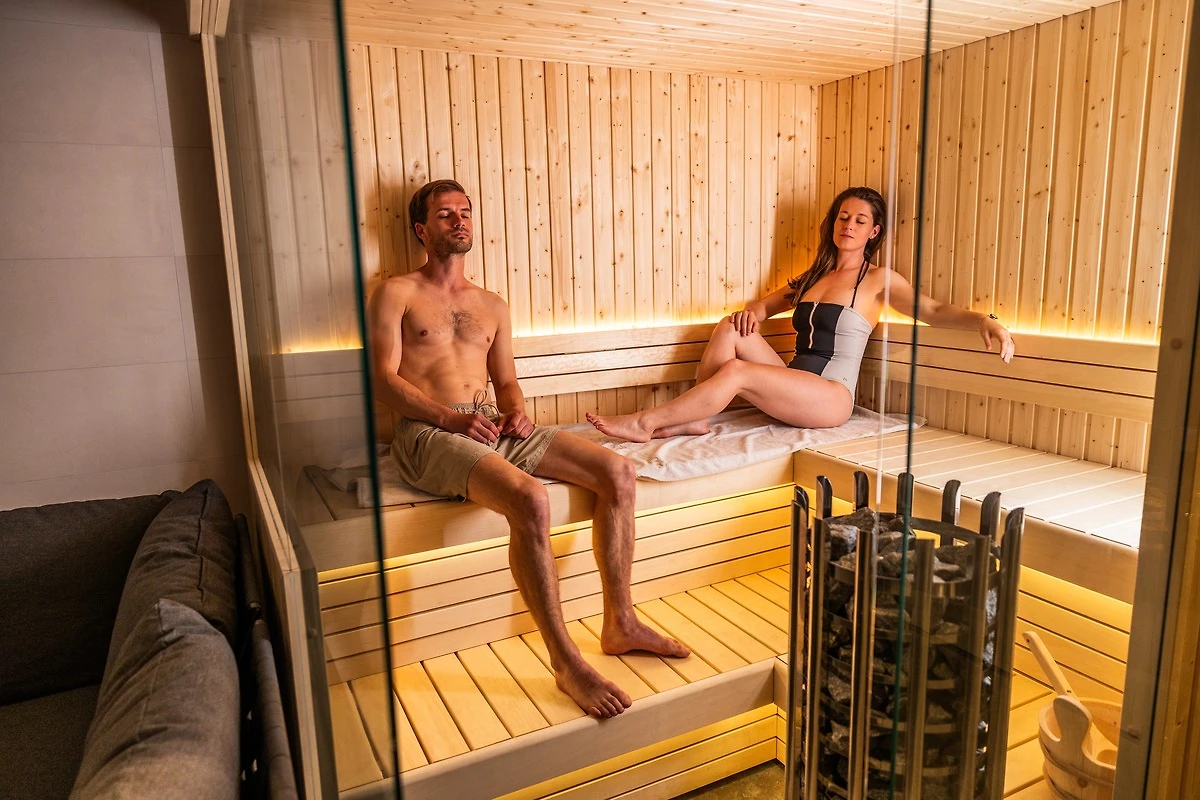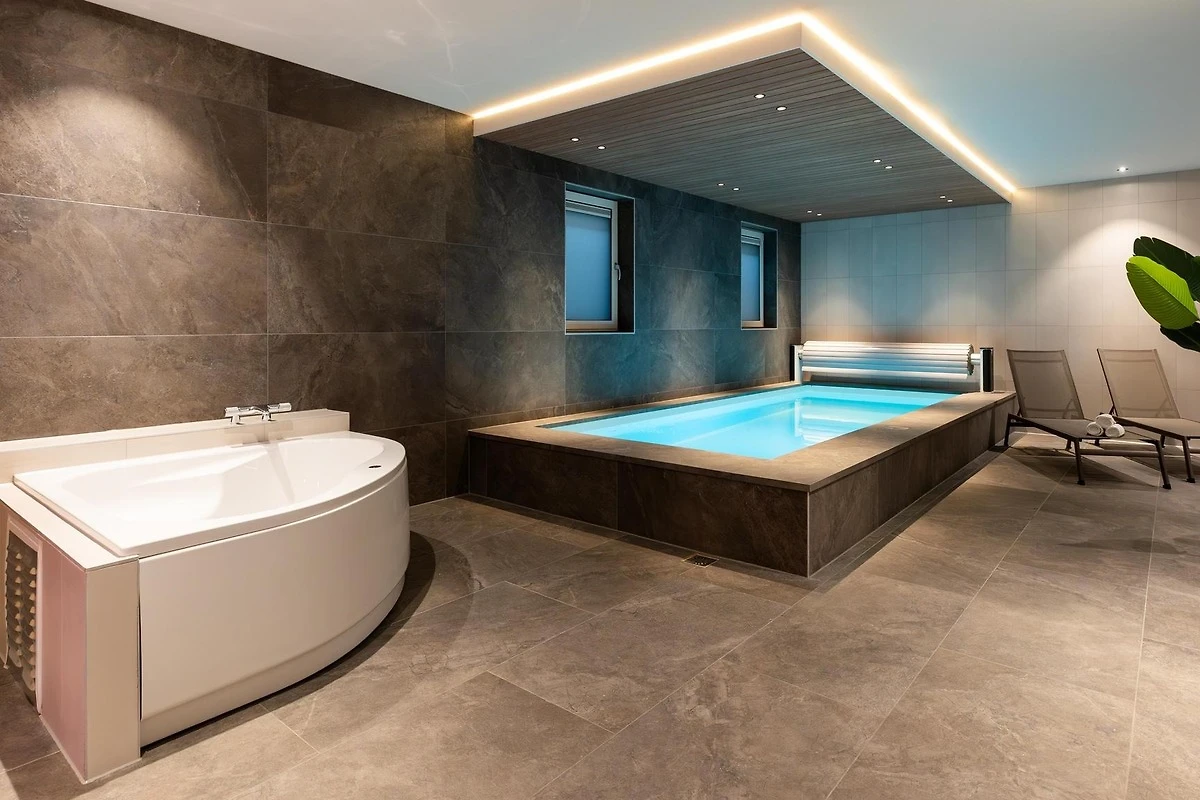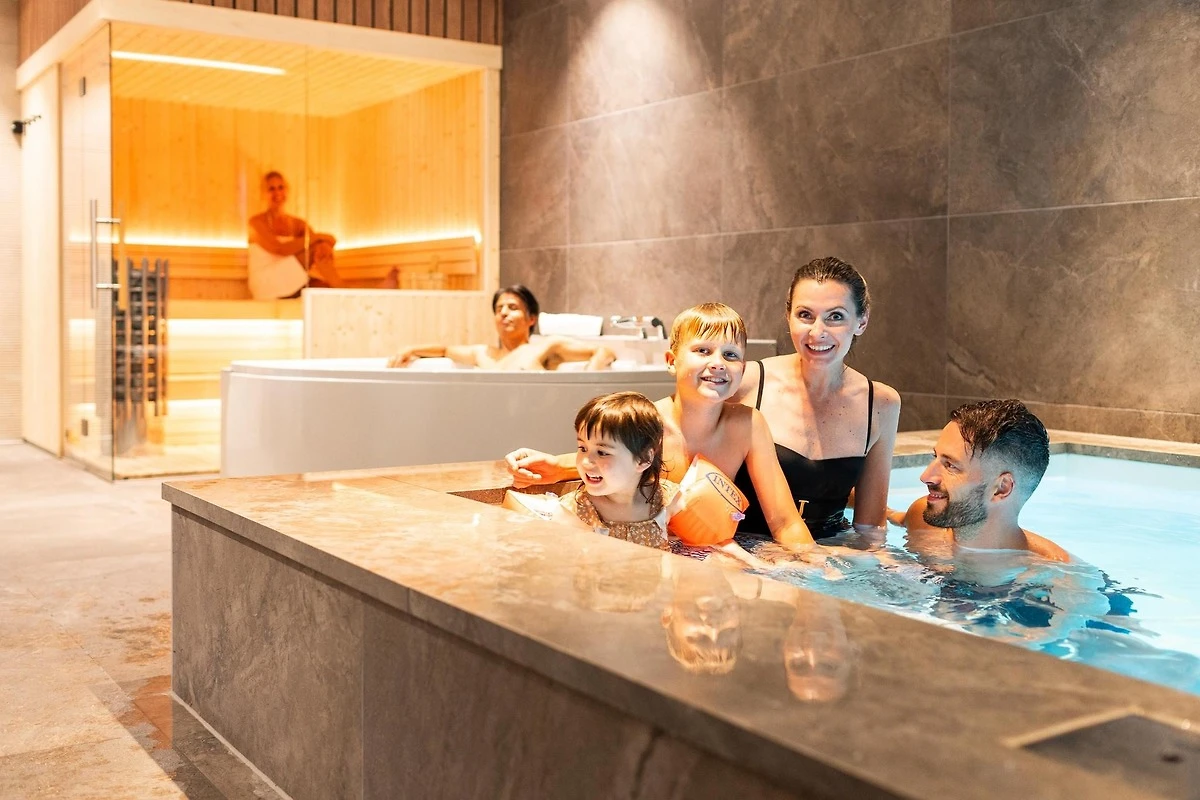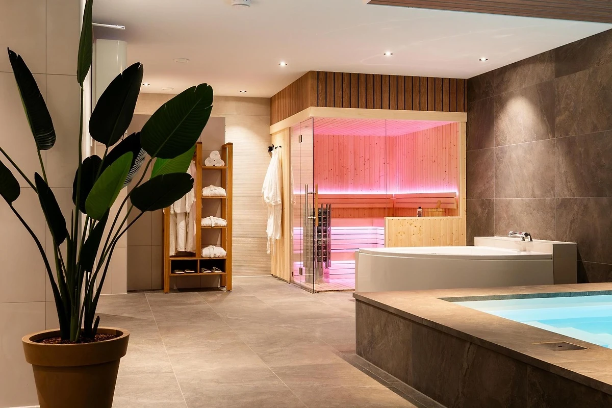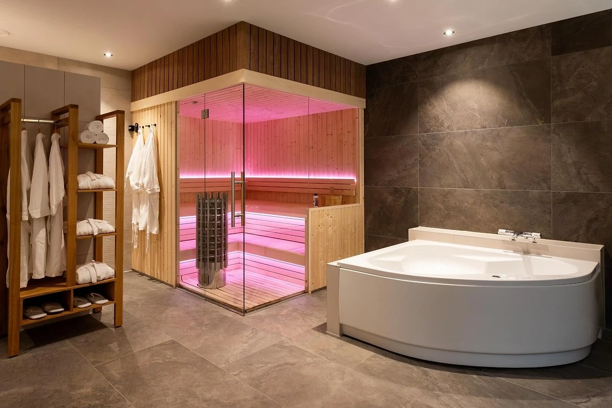Das Obergeschoss bietet drei Schlafzimmer, eines davon mit eigenem Bad. Das zweite Schlafzimmer ist mit zwei Etagenbetten ausgestattet – ideal für Kinder oder zusätzliche Gäste. Das dritte Schlafzimmer teilt sich mit dem zweiten das vierte Badezimmer.Entspannung im Spa- & Wellnessbereich