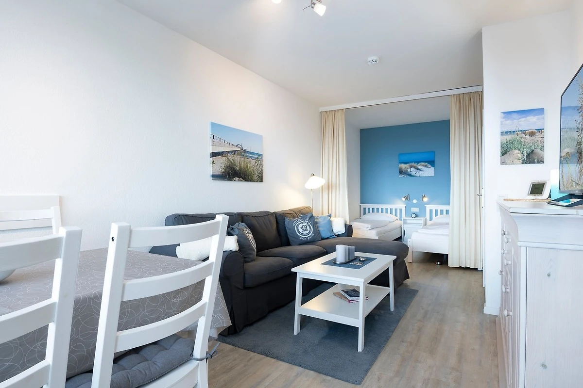 Der Wohn-Schlafraum verleitet mit Sofa und TV (internetfähig inkl. vorinstallierten Streaming-Apps, wie Netflix etc.) nicht nur zu gemütlichen Stunden, sondern lädt mit 2 Einzelbetten (2x 90x200 cm) auch zum Träumen ein. Ein Vorhang sorgt für eine optische Trennung vom Wohnbereich. In der separaten Küche finden Sie u. a. eine Geschirrspülmaschine und eine Kaffeemaschine. Geniessen Sie die selbst zubereiteten Mahlzeiten am ausziehbaren Esstisch mit Blick auf die Ostsee. Im Schlafzimmer erwartet Sie ein Kojenbett (ca. 80x200 cm), dessen Liegefläche sich bequem auf 160x200 cm ausziehen lässt, sowie ein Kleiderschrank zum Verstauen Ihres Reisegepäcks. Das Duschbad ist hell gefliest.