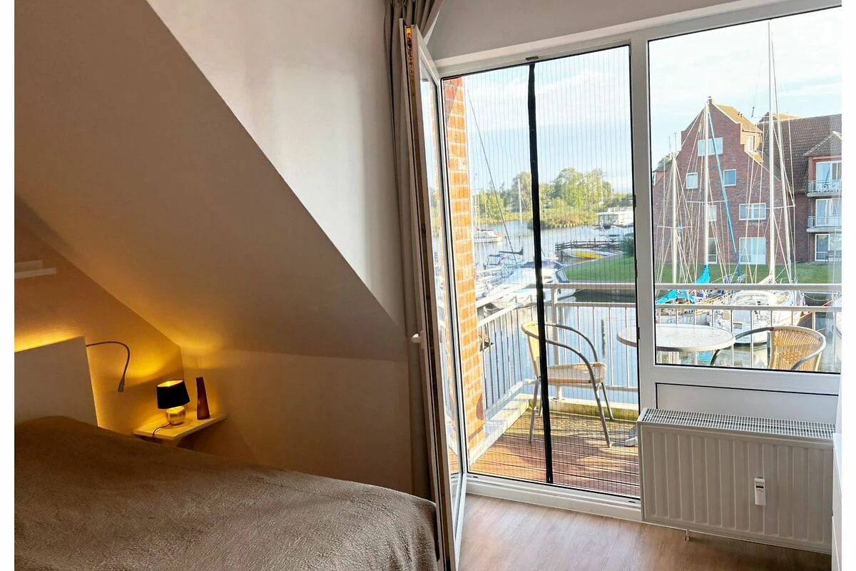 Geniessen Sie vom Balkon aus einen einzigartigen Blick über den Hafen und die Hafeneinfahrt, die Uecker und in der Ferne das Stettiner Haff und die weite Küstenlandschaft - mit maritimer Stimmung von früh bis spät, perfekt für den ersten Kaffee am Morgen oder ein Glas Wein bei Sonnenuntergang.