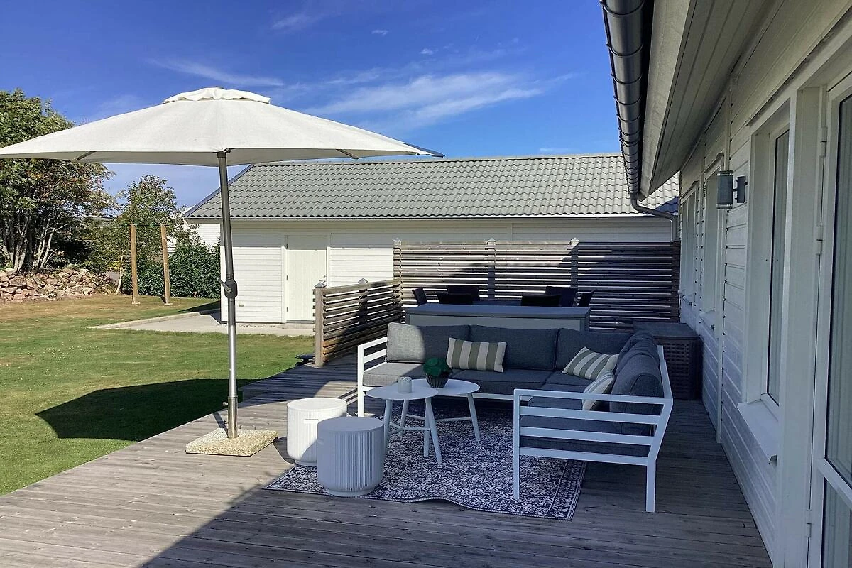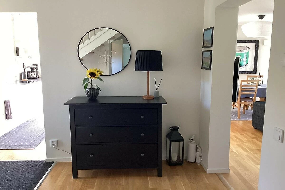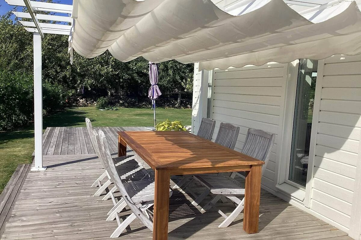 A lovely holiday home on the outskirts of Torekov. A spacious house with high quality in both equipment and materials. Enjoy the various patios on the lush plot. An excellent starting point for all the attractions on the peninsula. Suitable for several families or couples who want to holiday together On the ground floor of the house there is a well-equipped kitchen with dining area, open to the living room which has comfortable sofa furniture and a smart TV without channels. The larger bedroom has a double bed and the smaller one has a bunk bed. The bathroom is fully tiled with a shower. There is a washing machine in the hallway. Upstairs there are three bedrooms. Two have a double bed and one has a single bed. The living room has a sofa group and a smart TV. The bathroom has a shower. The house has free wifi. Around the house there is a lovely spacious terrace with several different outdoor furniture and sun loungers. Here you can enjoy and socialize with both morning coffee and barbecue evenings. In the rear of the attached garage there is a room with a double bed and bathroom with shower. Torekov's picturesque harbor is the heart of the city with a wonderful boating life. There are restaurants and an ice cream parlor here. Don't miss taking a refreshing swim from the morning jetty. Ferries leave from the harbor to Halland's Väderö. Here you will find a magically beautiful nature reserve. Right next to the harbor area is a lovely beach with a jetty. Further along the coast along the beautiful Italian road, you will reach the tennis metropolis of Båstad. Also visit Hovs Hallar, a magnificent nature experience. A visit to the beautiful gardens in Norrviken is also recommended. South along the coast towards Ängelholm there are several lovely beaches and small harbor towns. Ängelholm offers an exciting mix of small specialty shops, exclusive boutiques and several large chains. Ängelholm's Hembygdspark is an oasis for the whole family. The park houses a zoo, museum buildings and a playground for the younger ones. There are walking paths, rest areas and eating areas. On the Bjäre peninsula there are several hiking trails and walking areas. There are 7 golf courses within a few kilometers. The closest is Torekov's exciting "links course".
