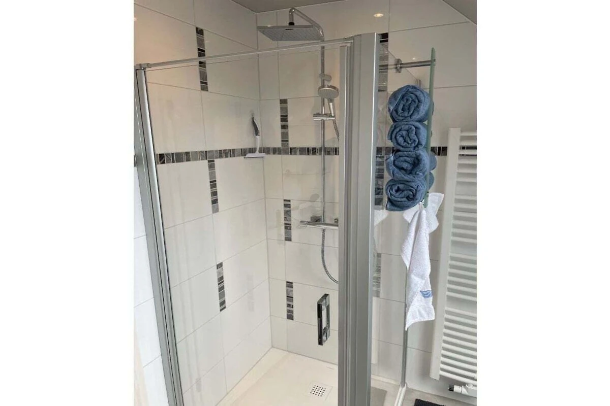 Im neuen Bad erwartet Sie eine Ganzglasdusche in Komfortgröße mit neuer hochwertiger Badausstattung.