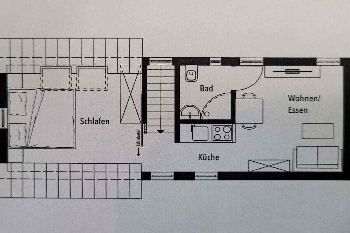 Die gemütliche und komfortable 2-Raum Ferienwohnung in der zweiten Etage bietet Ihnen 1 Schlafzimmer (Dachschräge), Wohnzimmer mit integrierter Küche, Badezimmer und kleiner Flur. Die 26qm sind perfekt geplant und die Räumlichkeiten gut aufgeteilt.