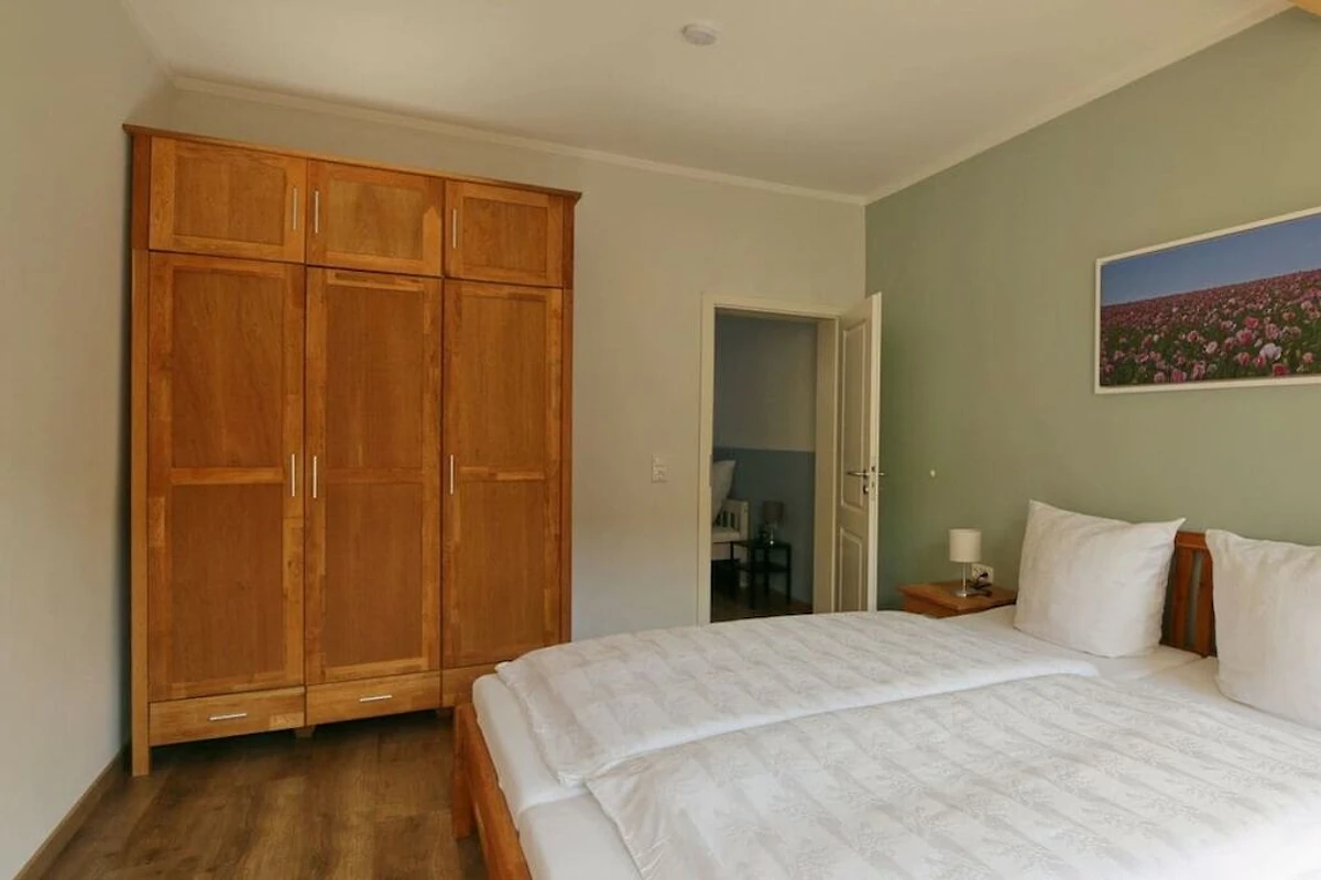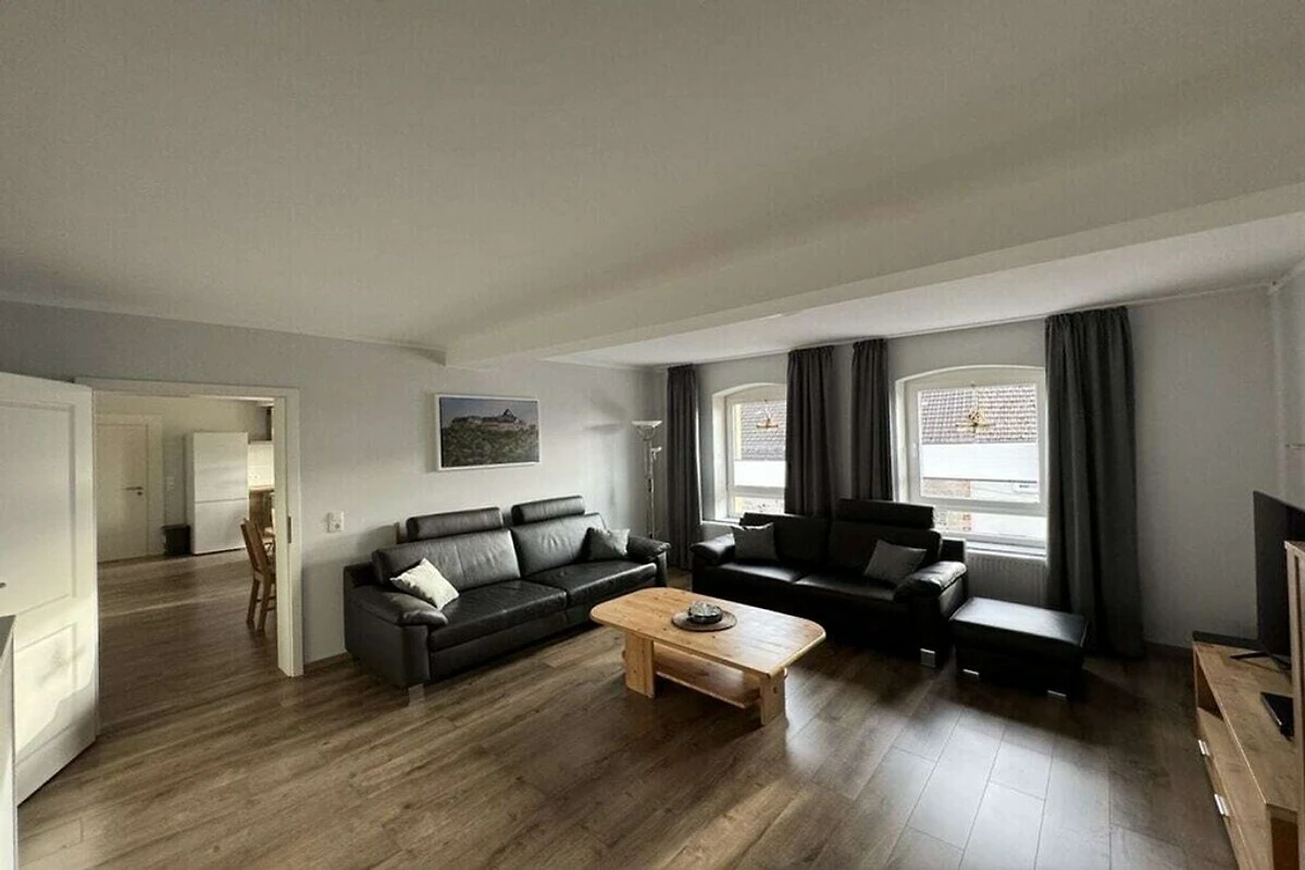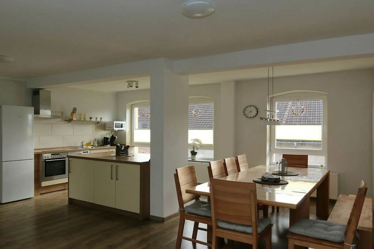 10 Personen und ein Baby können in der 140m² großen Wohnung im Obergeschoss untergebracht werden, die Wohnung wird über ein separates Treppenhaus im Nebengebäude erreicht. Die helle und großzügig geschnittene Wohnung verfügt über 4 Schlafzimmer und 2 große Badezimmer mit barrierefreien (Wellness-) Duschen. Im Wohnzimmer befinden sich mit einem Schrankbett und einem Schlafsofa 2 weitere Schlafmöglichkeiten.