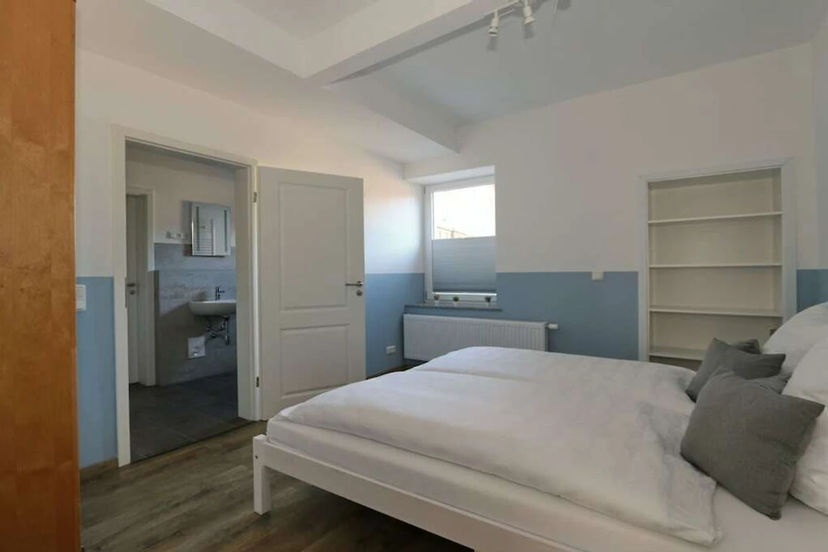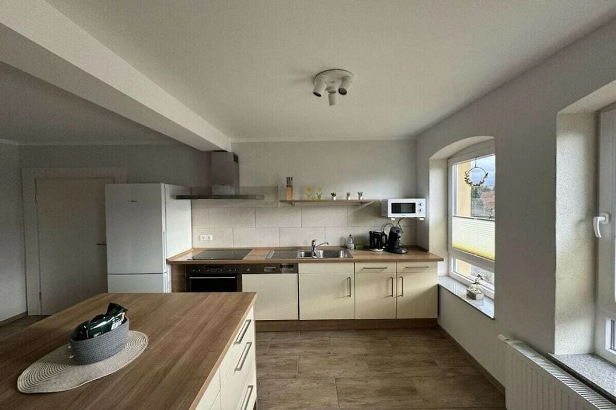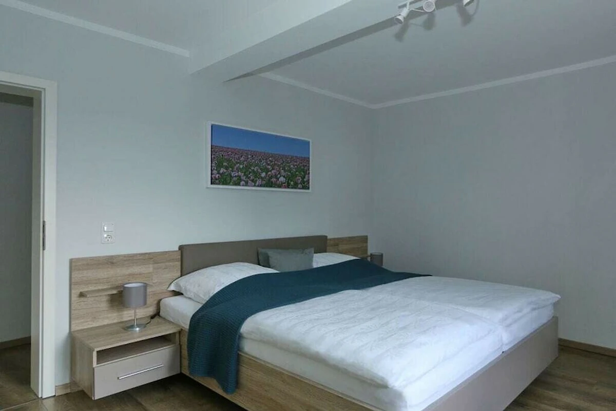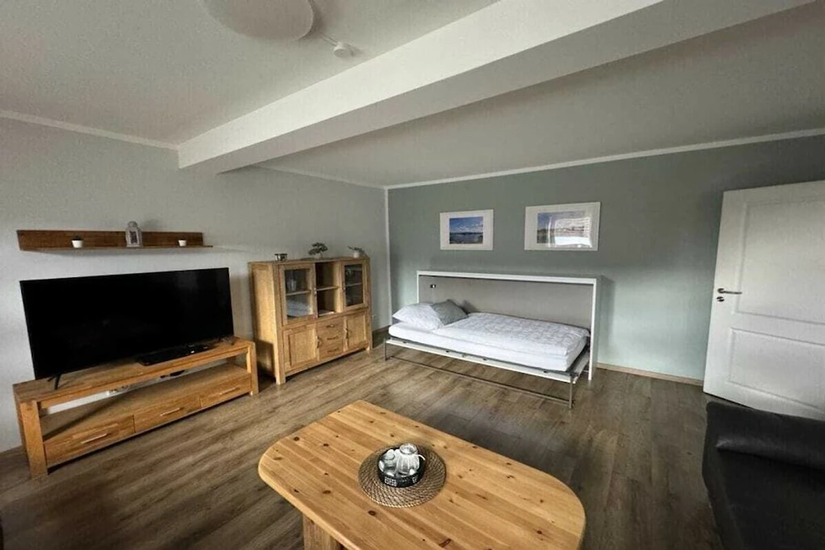10 Personen und ein Baby können in der 140m² großen Wohnung im Obergeschoss untergebracht werden, die Wohnung wird über ein separates Treppenhaus im Nebengebäude erreicht. Die helle und großzügig geschnittene Wohnung verfügt über 4 Schlafzimmer und 2 große Badezimmer mit barrierefreien (Wellness-) Duschen. Im Wohnzimmer befinden sich mit einem Schrankbett und einem Schlafsofa 2 weitere Schlafmöglichkeiten.