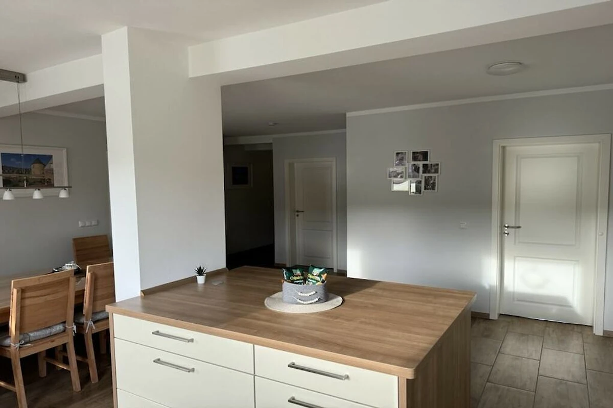 Die geräumige Küche besitzt eine Kücheninsel und ist mit einem Geschirrspüler und einer Kühlschrank/Gefrierschrankkombination, Mikrowelle und 2 Kaffeemaschinen voll ausgestattet. Der Essbereich und die Küche befinden sich in einem geräumigen Raum, der Lust auf gemeinsame Kochabende macht. Auch diese Wohnung verfügt über eine eigene Terrasse mit Gartenmöbeln und Grill.