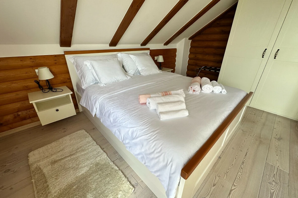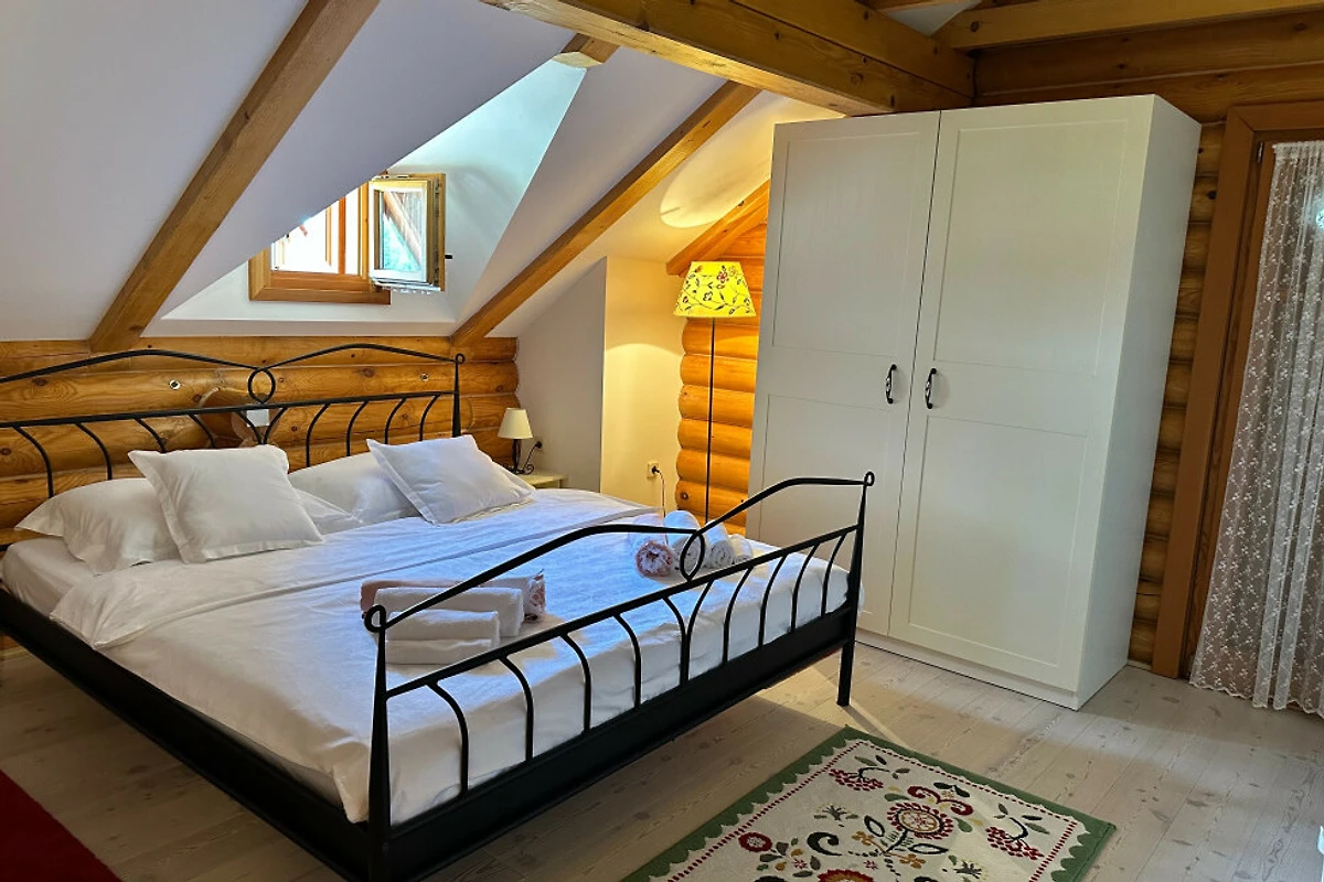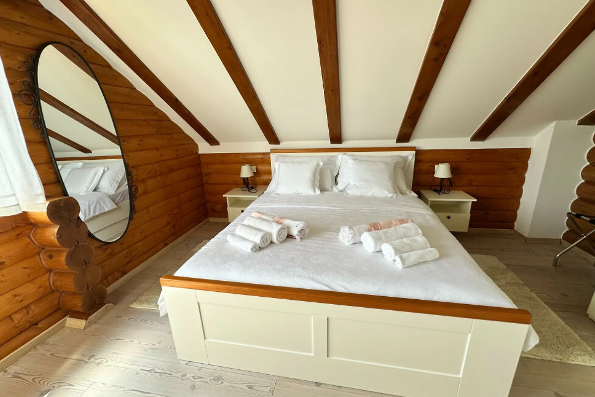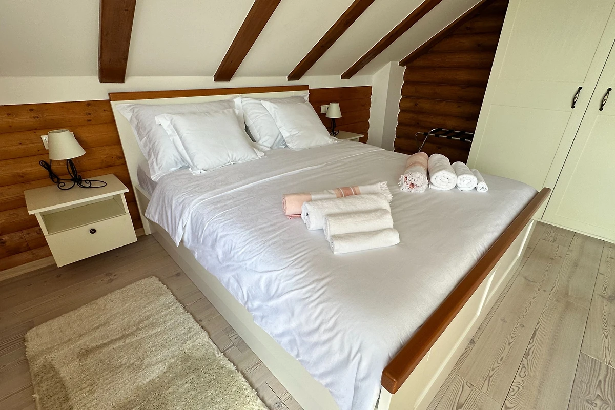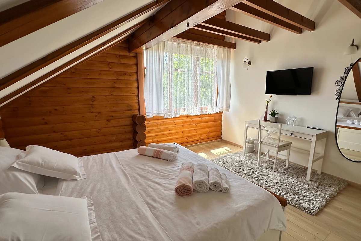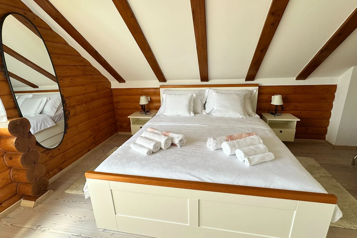 Entdecken Sie Villa Pine Log, einen atemberaubenden ländlichen Rückzugsort, der ideal für Familien und Paare ist, die eine ruhige Auszeit suchen. Diese geräumige Villa bietet bequem Platz für bis zu 6 Gäste in 3 luxuriösen Schlafzimmern mit Kingsize-Betten und bietet eine perfekte Balance aus Komfort und Eleganz.