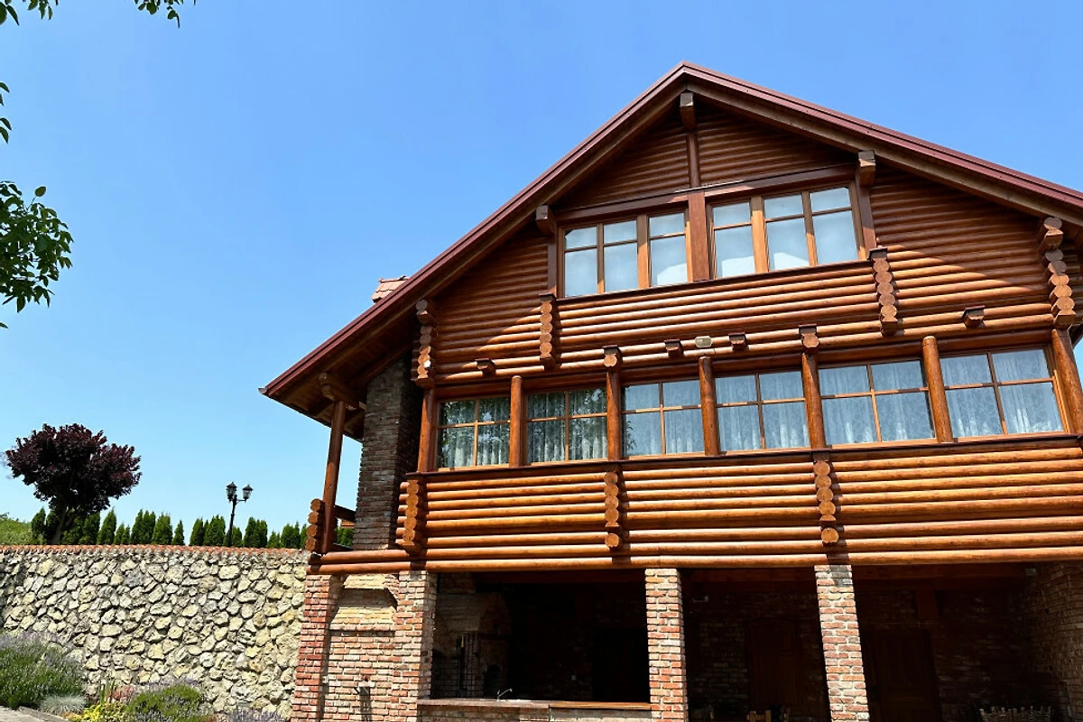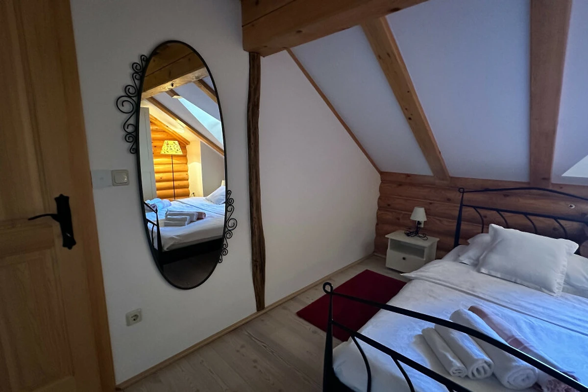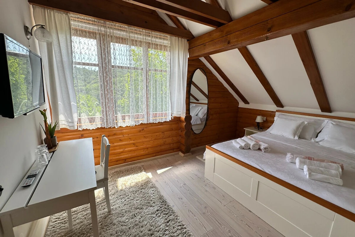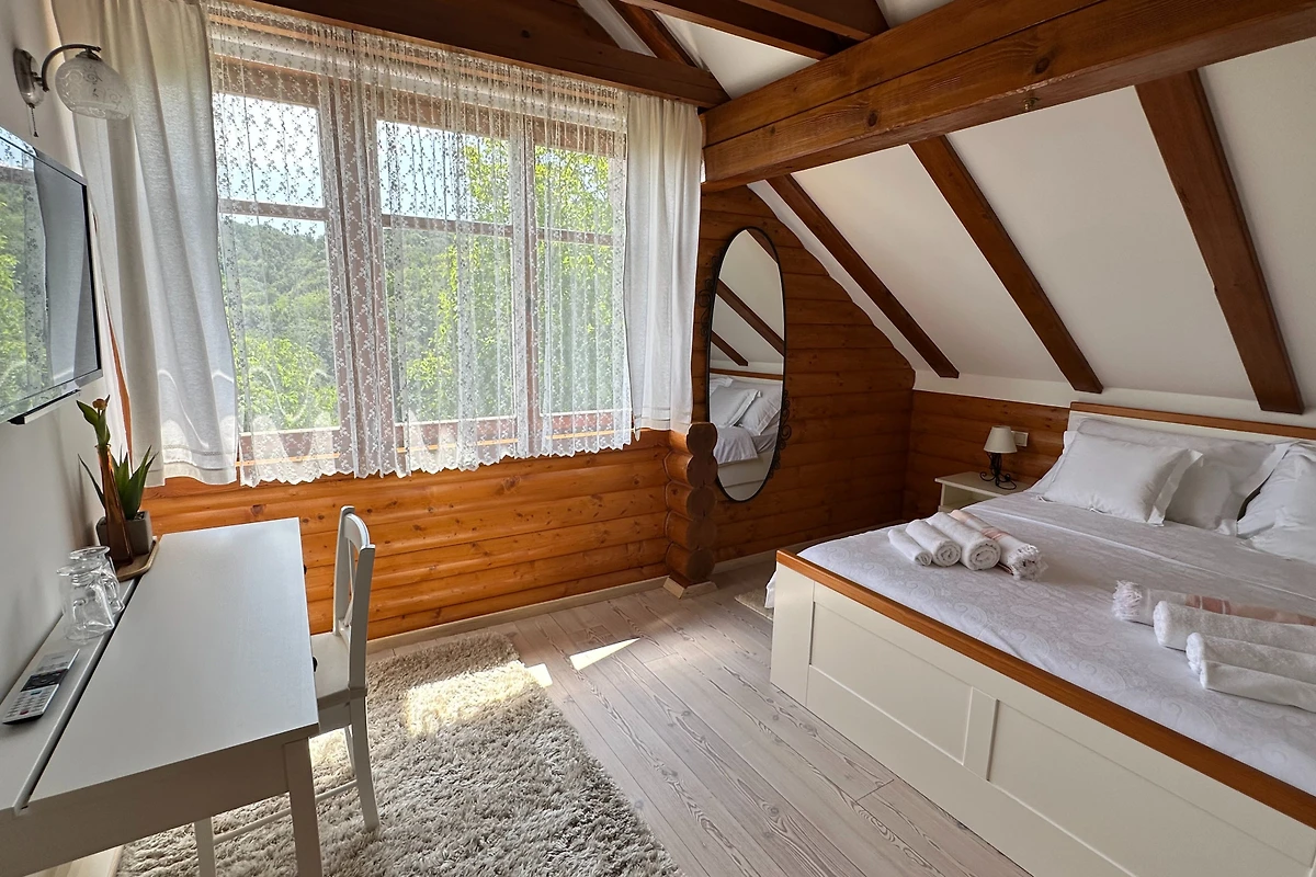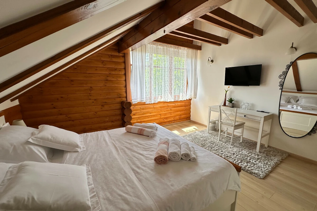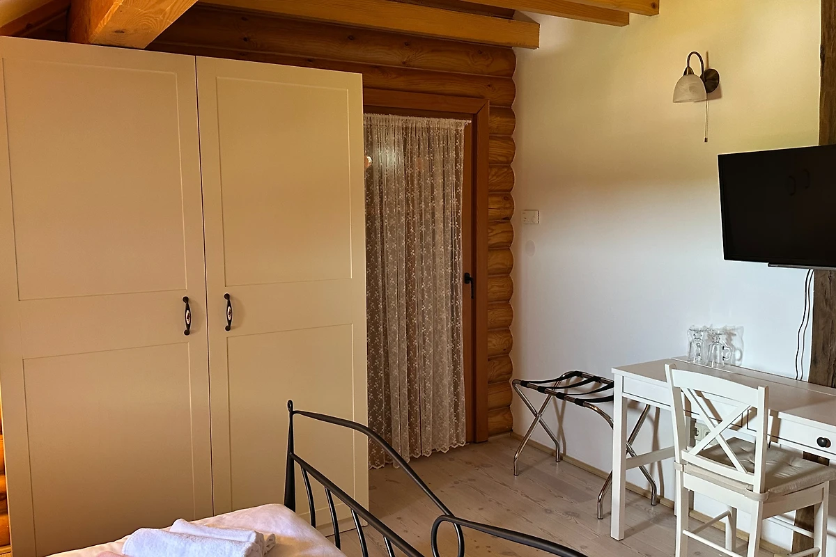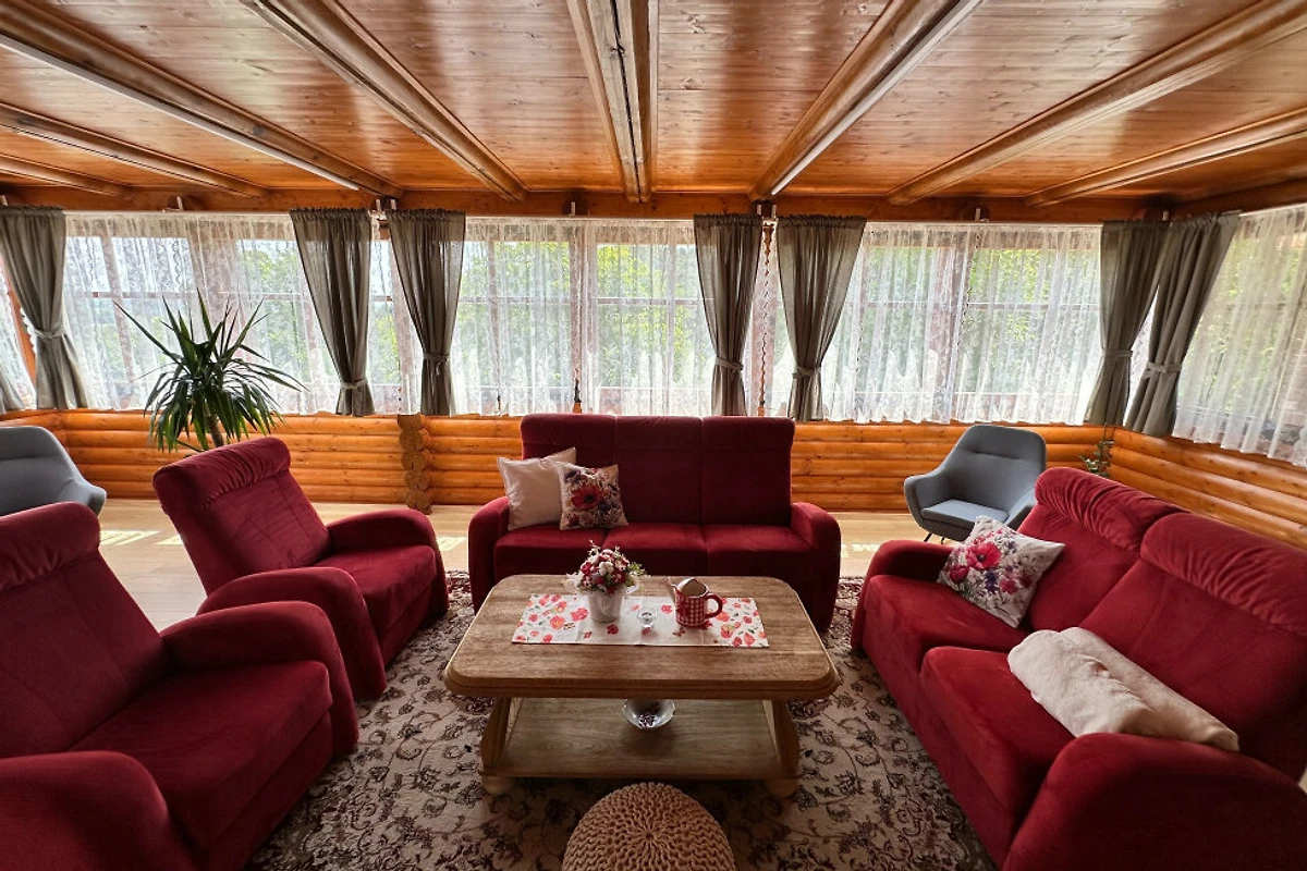 Entdecken Sie Villa Pine Log, einen atemberaubenden ländlichen Rückzugsort, der ideal für Familien und Paare ist, die eine ruhige Auszeit suchen. Diese geräumige Villa bietet bequem Platz für bis zu 6 Gäste in 3 luxuriösen Schlafzimmern mit Kingsize-Betten und bietet eine perfekte Balance aus Komfort und Eleganz.