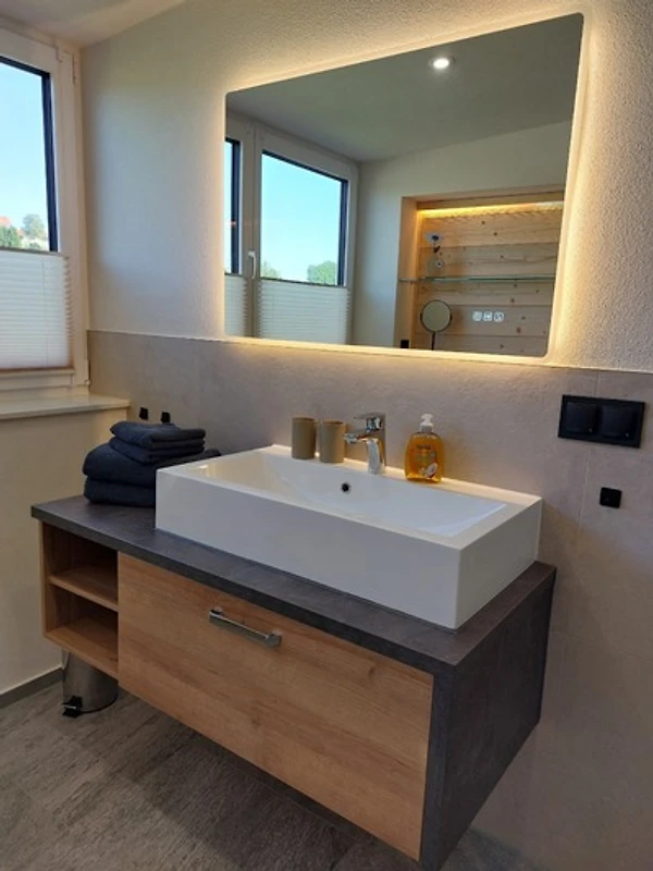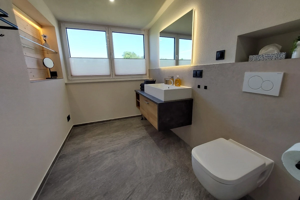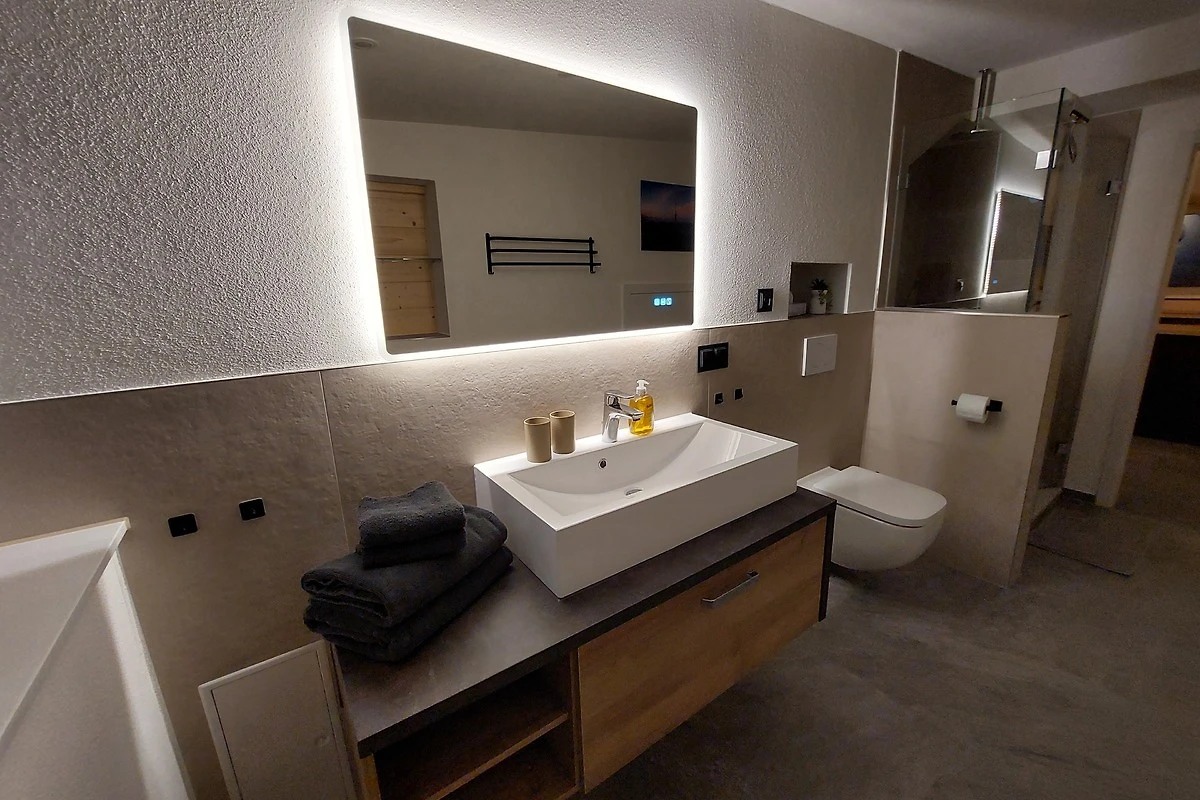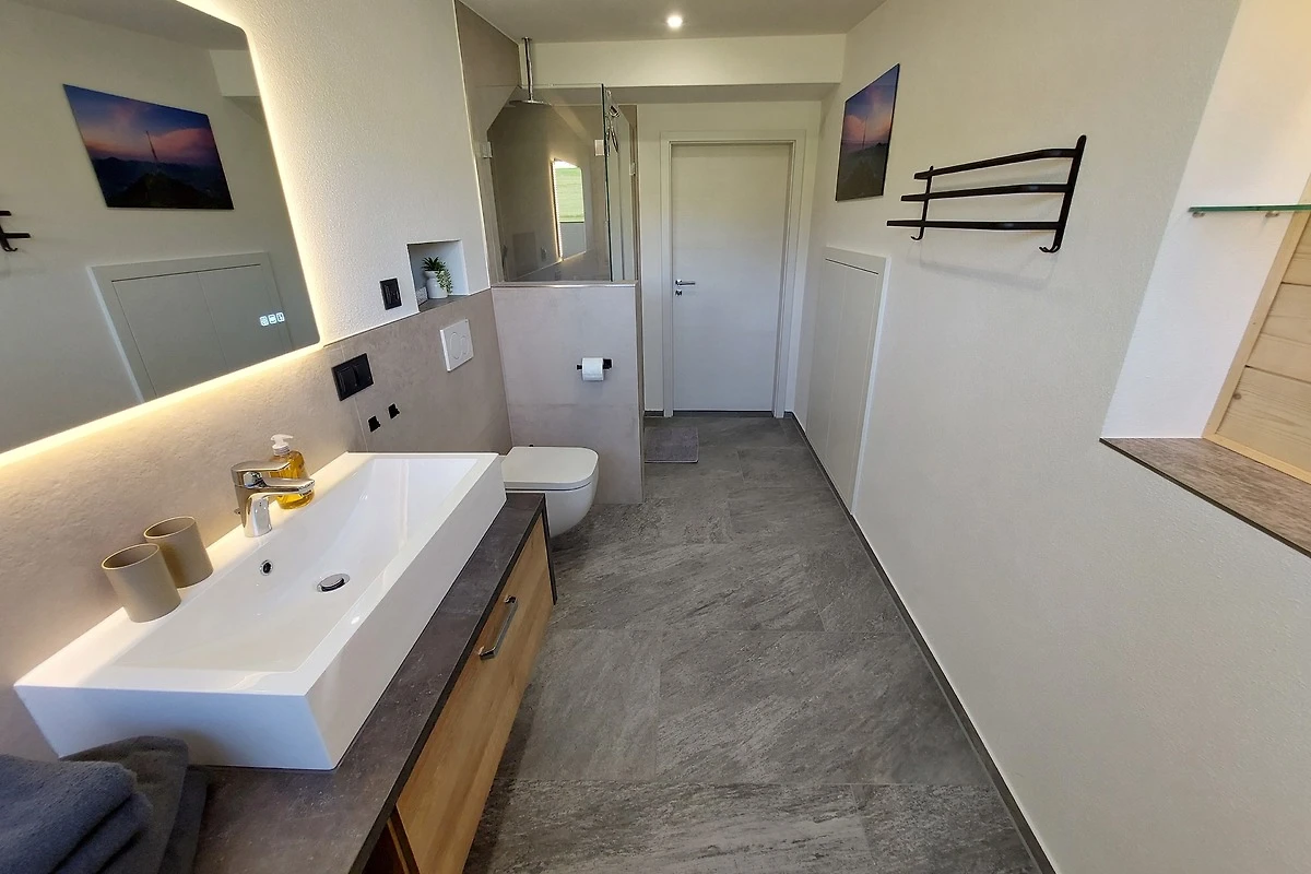 Bad mit grosser Regenwalddusche, Toilette, Waschbecken und reichlich Abstellmöglichkeiten