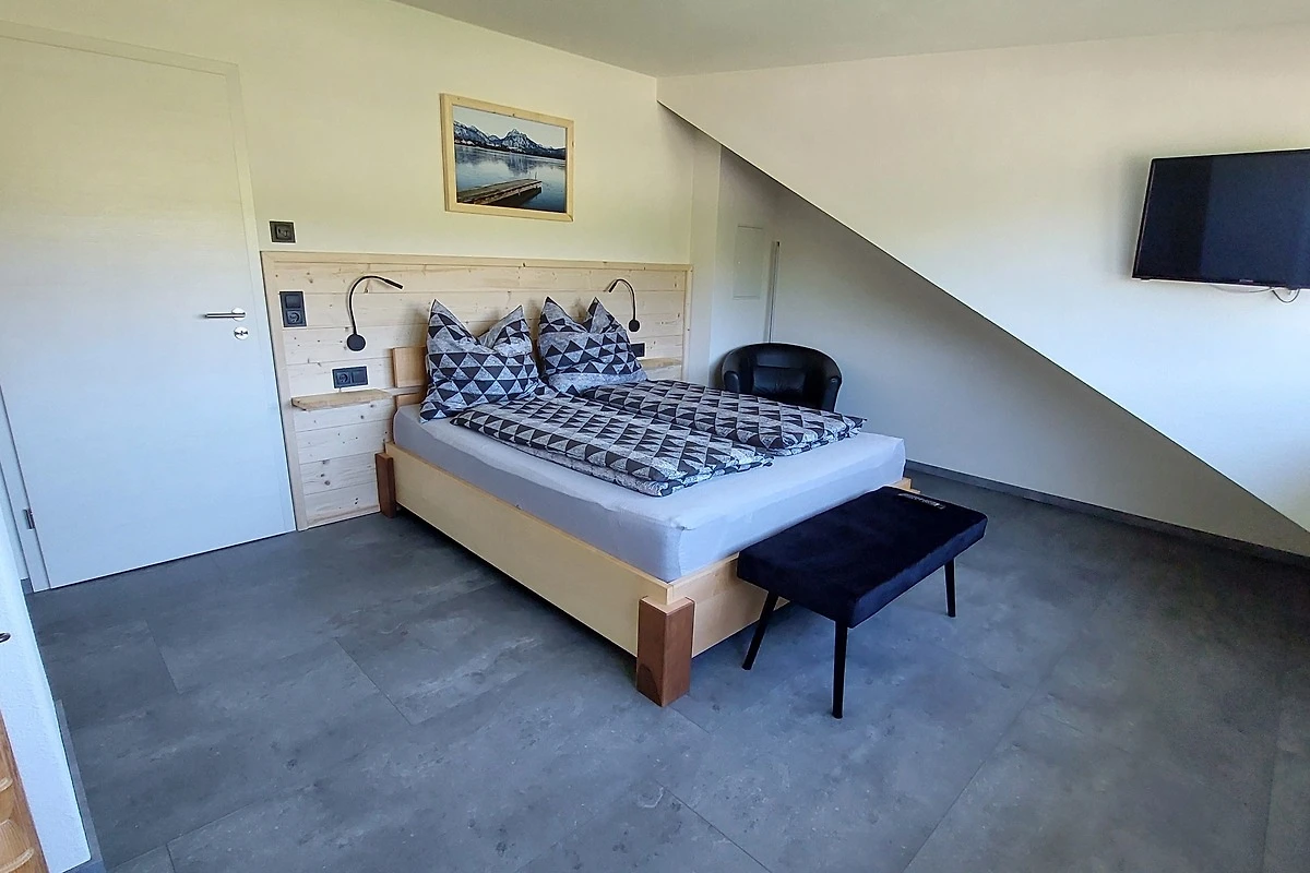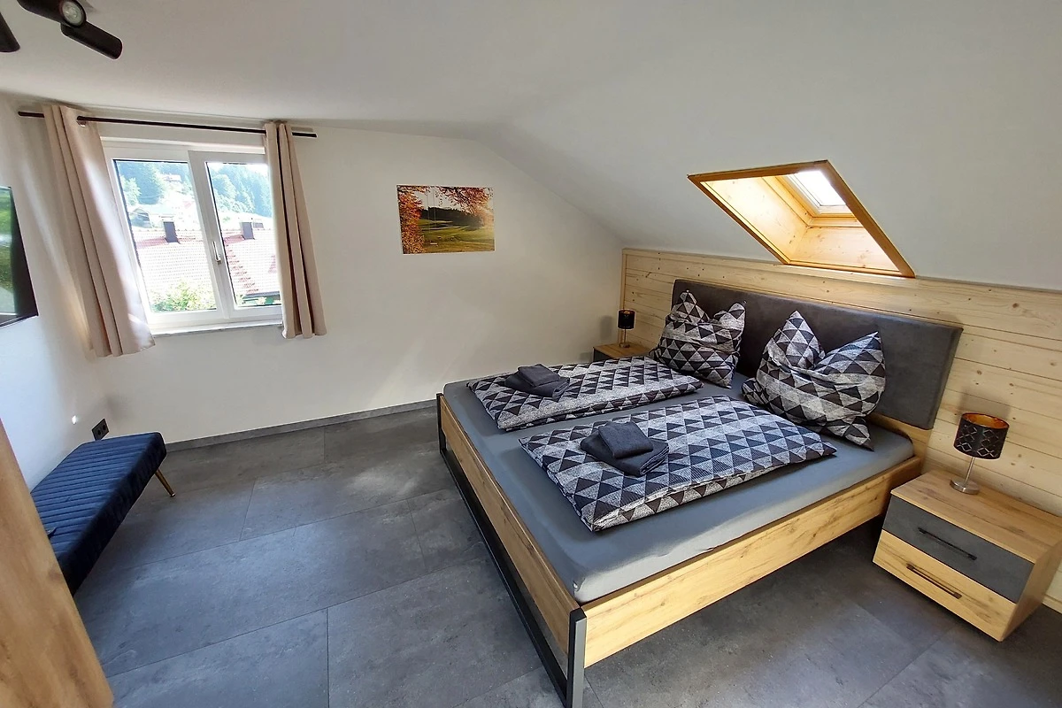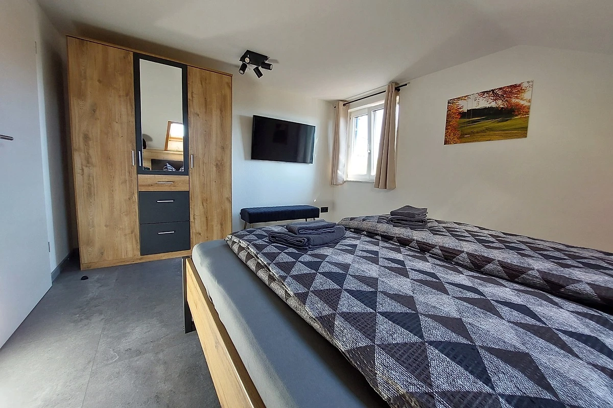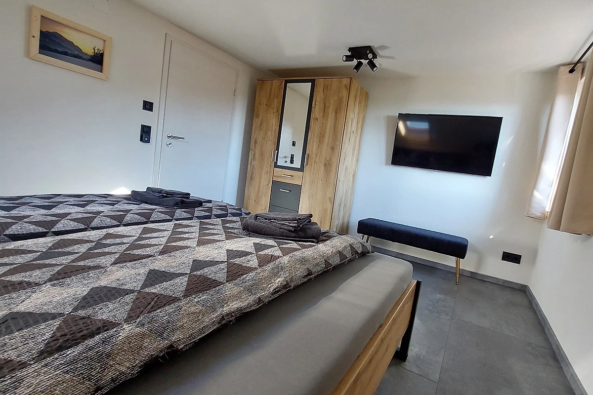 Schlafzimmer mit bequemem Betten, Kleiderschränke und TVs