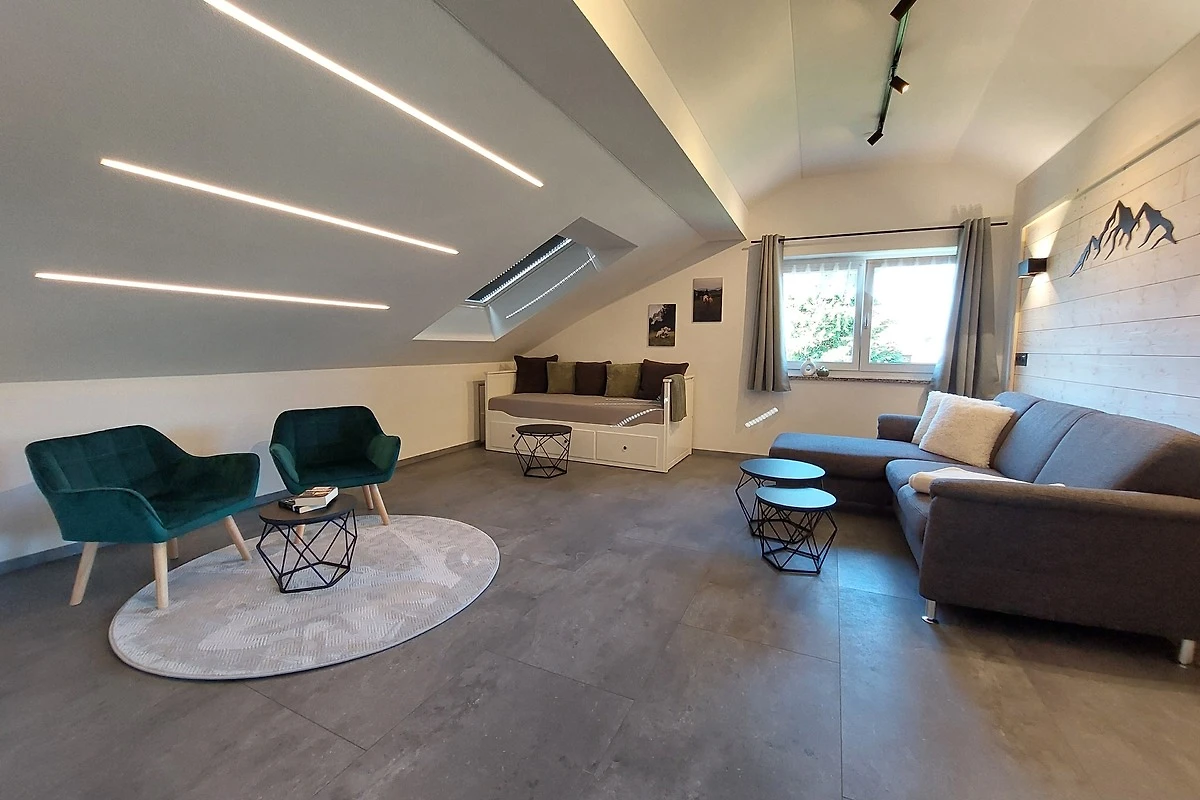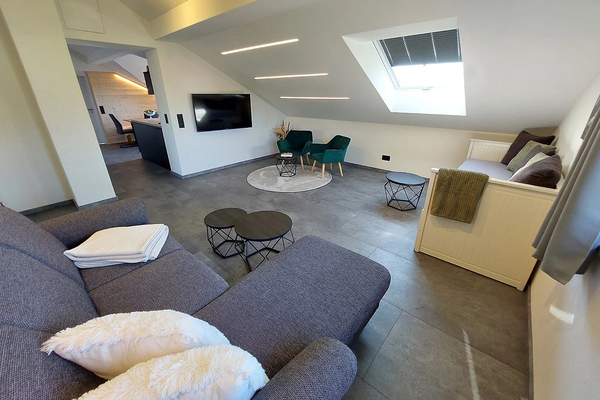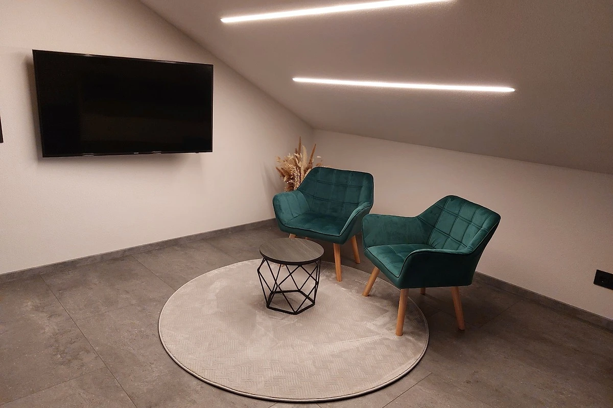 Wohnbereich mit gemütlichen Sitzgelegenheiten und Netflix, ebenfalls mit LED Beleuchtung