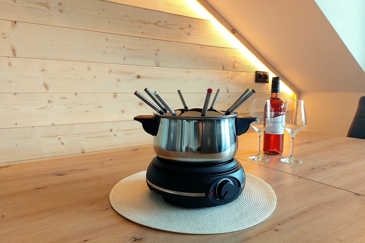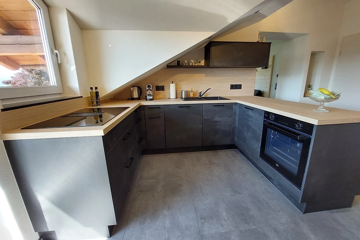 vollausgestattete Küche mit Essbereich und LED Beleuchtung