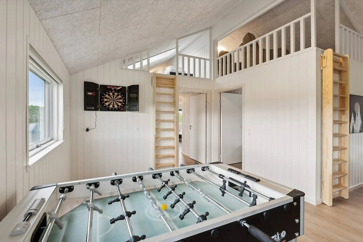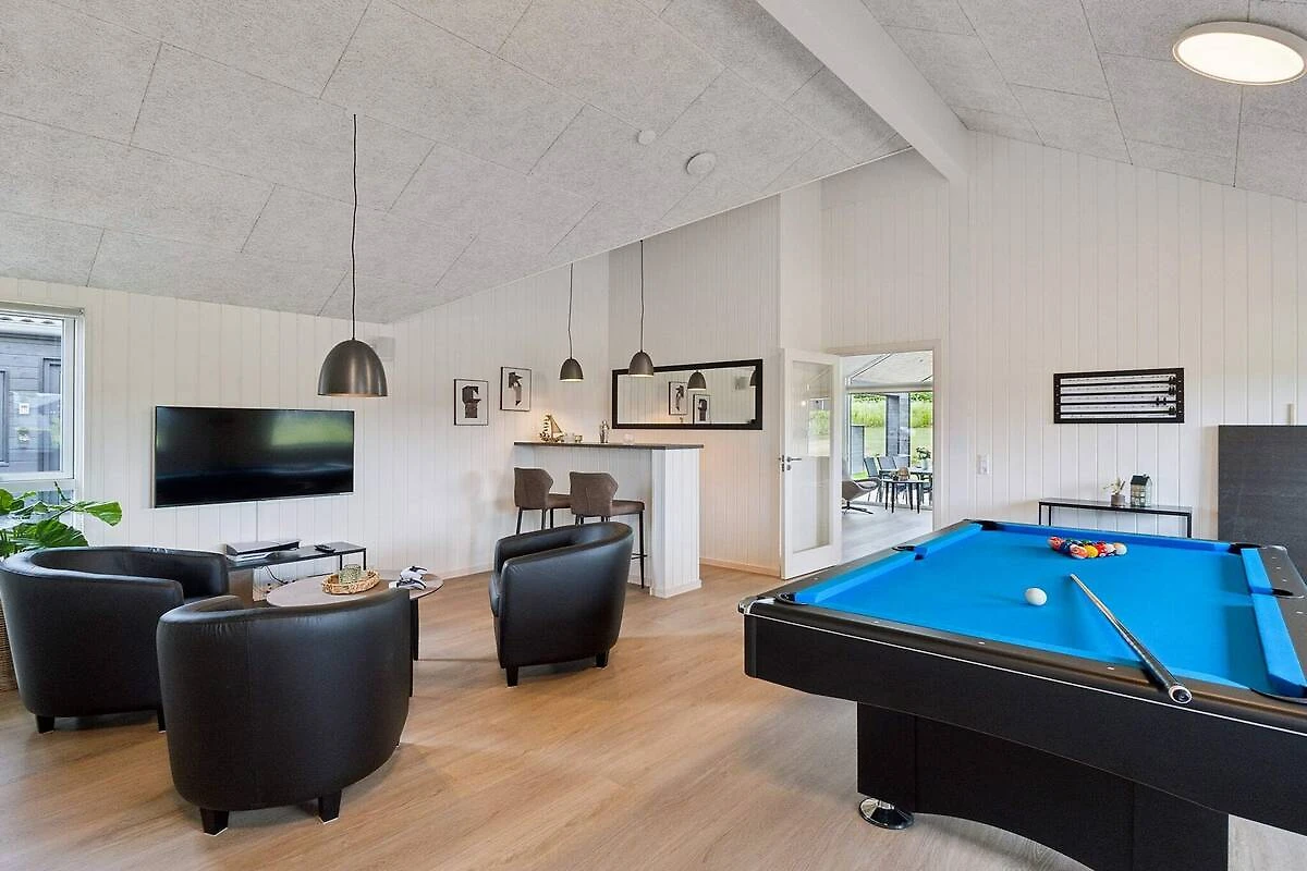 Wohnzimmer(Trockner, Waschmaschine), Küche(Kochherd(2 Kochplatten), Backofen, Mikrowelle, Spülmaschine, Kühlschrank, Kühl-/Gefrierkombination, Waschbecken), Wohn-/Schlafzimmer(TV(Deutsch Fernsehsender, dänische Fernsehsender, norwegische Fernsehsender, schwedische Fernsehsender)), Schlafzimmer(2x Einzelbett), Schlafzimmer(2x Einzelbett), Schlafzimmer(2x Einzelbett), Schlafzimmer(2x Einzelbett), Schlafzimmer(2x Einzelbett), Schlafzimmer(Doppelbett), Schlafzimmer(Doppelbett), Badezimmer(Waschbecken, Dusche, Toilette), Badezimmer(Waschbecken, Dusche, Toilette), Badezimmer(Waschbecken, Dusche, Toilette), Empore(4x Einzelbett), Kühlschrank, Whirlwanne(im Garten, erwärmt, 5 Personen), Sauna(im Garten), Pool(im Innenbereich), Tischtennisplatte, Tischfußball, Dart, Billard
