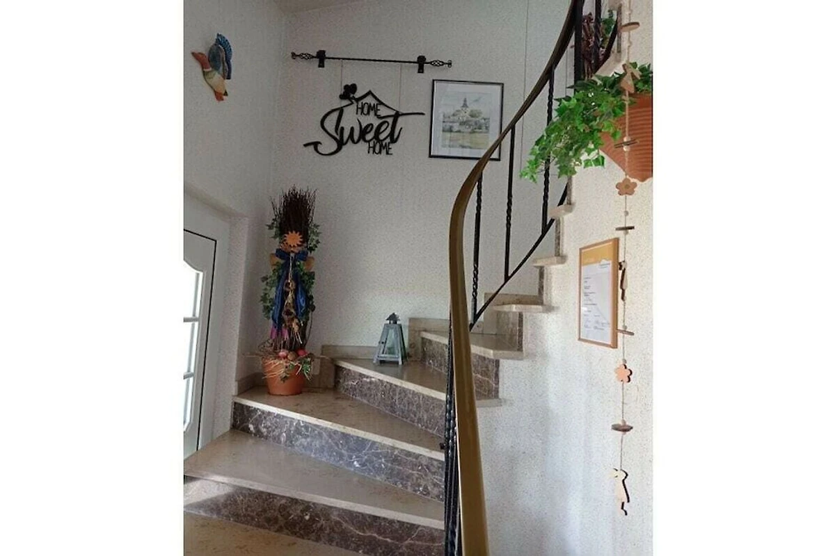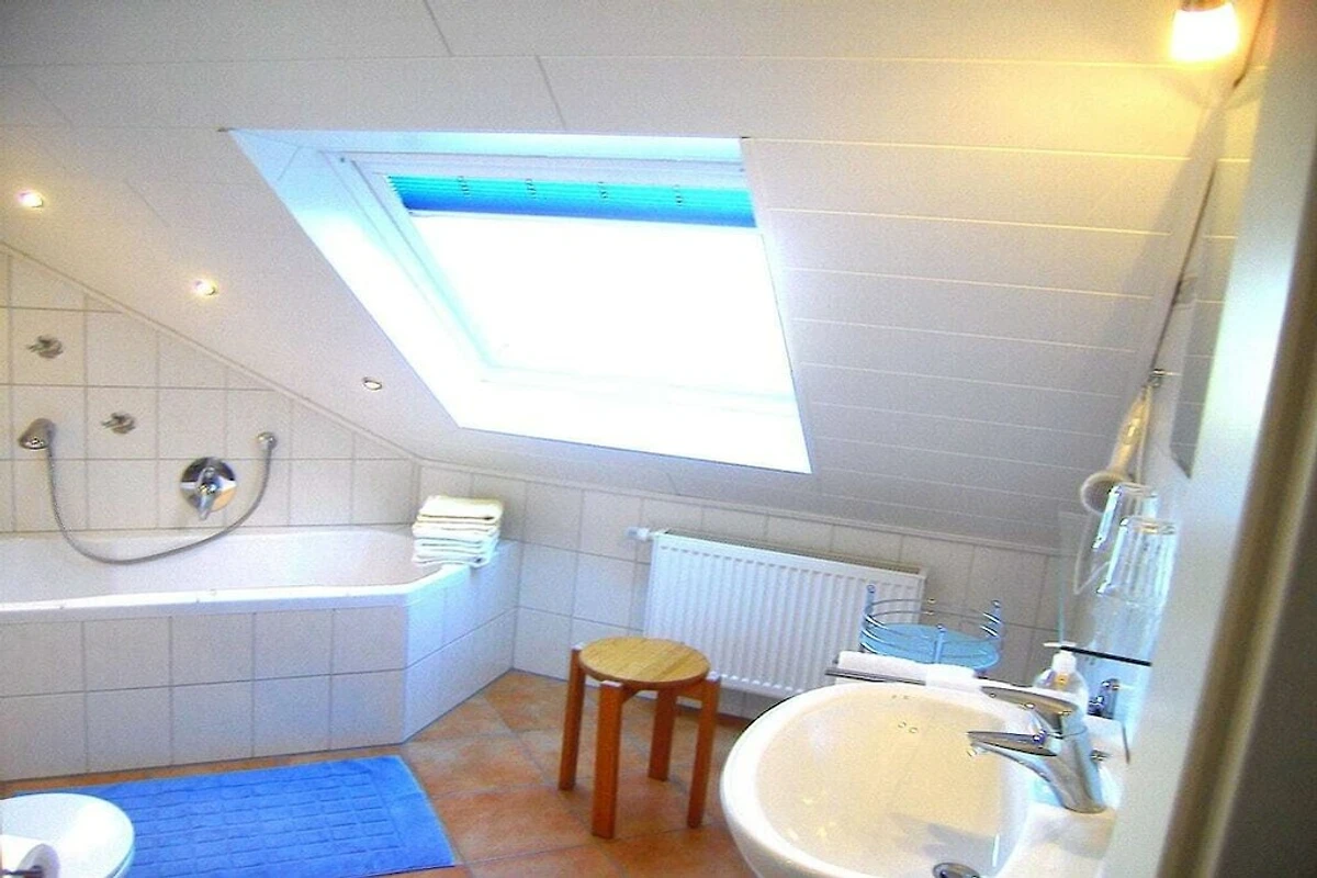 Dachgeschoss: (Schlafzimmer(, , Doppelbett, Radio), Badezimmer(, , Toilette, Badewanne, Dusche, Waschbecken, Föhn), guest toilet(, Toilette, Waschbecken), Abstellraum(, Bügelbrett, Bügeleisen))