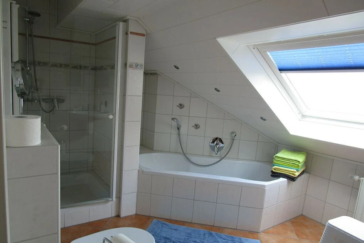 Großes Bad mit Badewanne, Dusche, WC, Fön, Gäste-WC