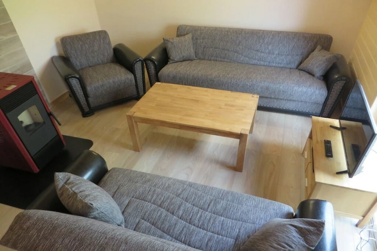 1 Wohn-/Essbereich mit moderner Küche (Backofen, Geschirrspülmaschine, Kühlschrank, Kaffeevollautomaten uvm.) und Holzpelletofen im Wohnzimmer, sowie direktem Zugang auf die Terrasse.