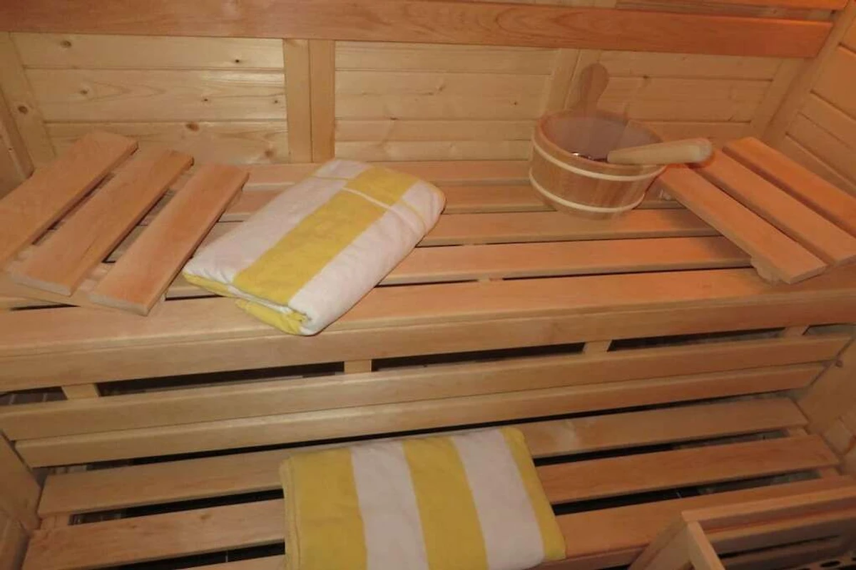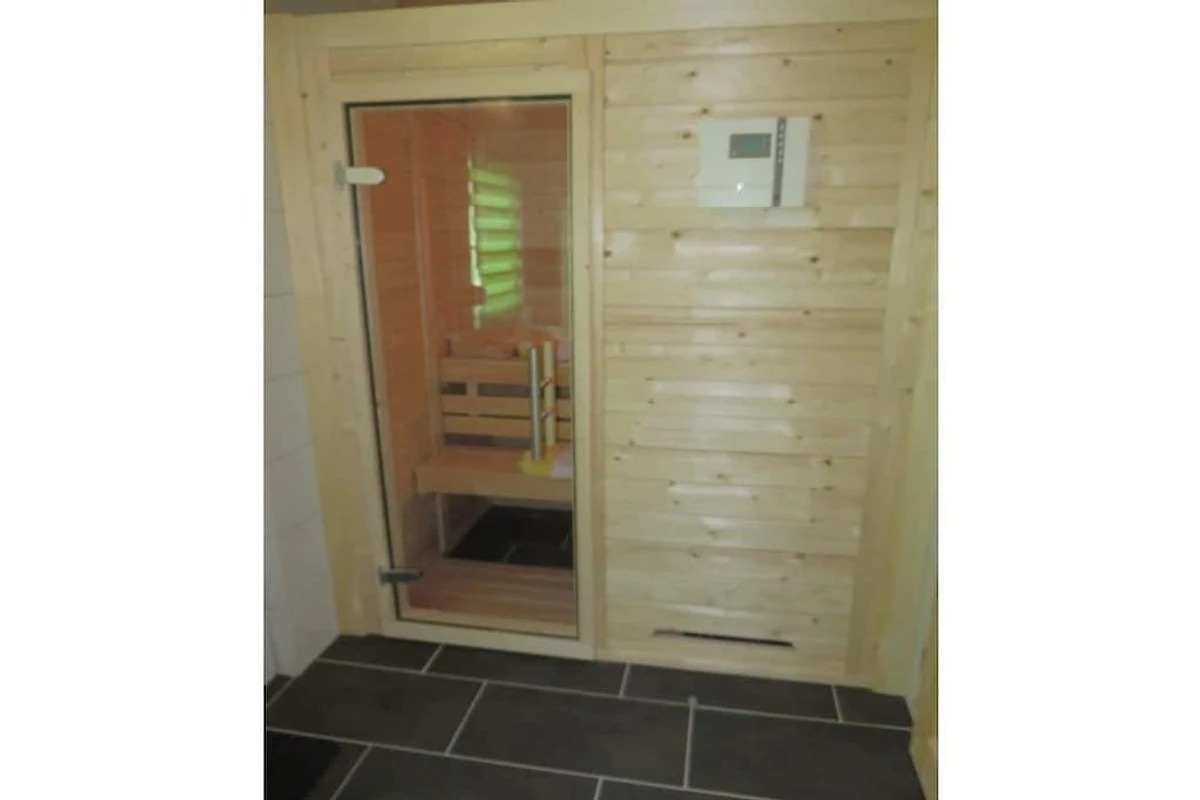 Parterre: (Eingangshalle(, ), Küche(, , , Esstisch, Kochplatte, Wasserkocher, Toaster, Kaffeemaschine, Backofen, Mikrowelle, Spülmaschine, Kühlschrank, Tiefkühlschrank, Hochstuhl, Küchenmaschine), Wohn/Esszimmer(, , TV, TV, Esstisch, Herd, Blu-ray-Player), Schlafzimmer(, , Doppelbett), Schlafzimmer(, , Doppelbett), Badezimmer(, , Toilette, Badewanne, Dusche, Waschbecken, Heizung, Föhn), Badezimmer(, Toilette, Sauna, Dusche, Dusche, Waschbecken, Waschmaschine))