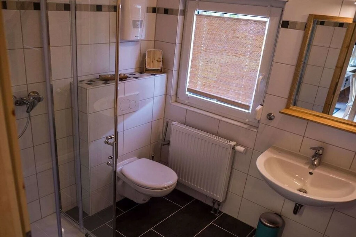 - 1 Badezimmer mit Dusche, Waschbecken, WC und Sauna (Nutzung kostenfrei)