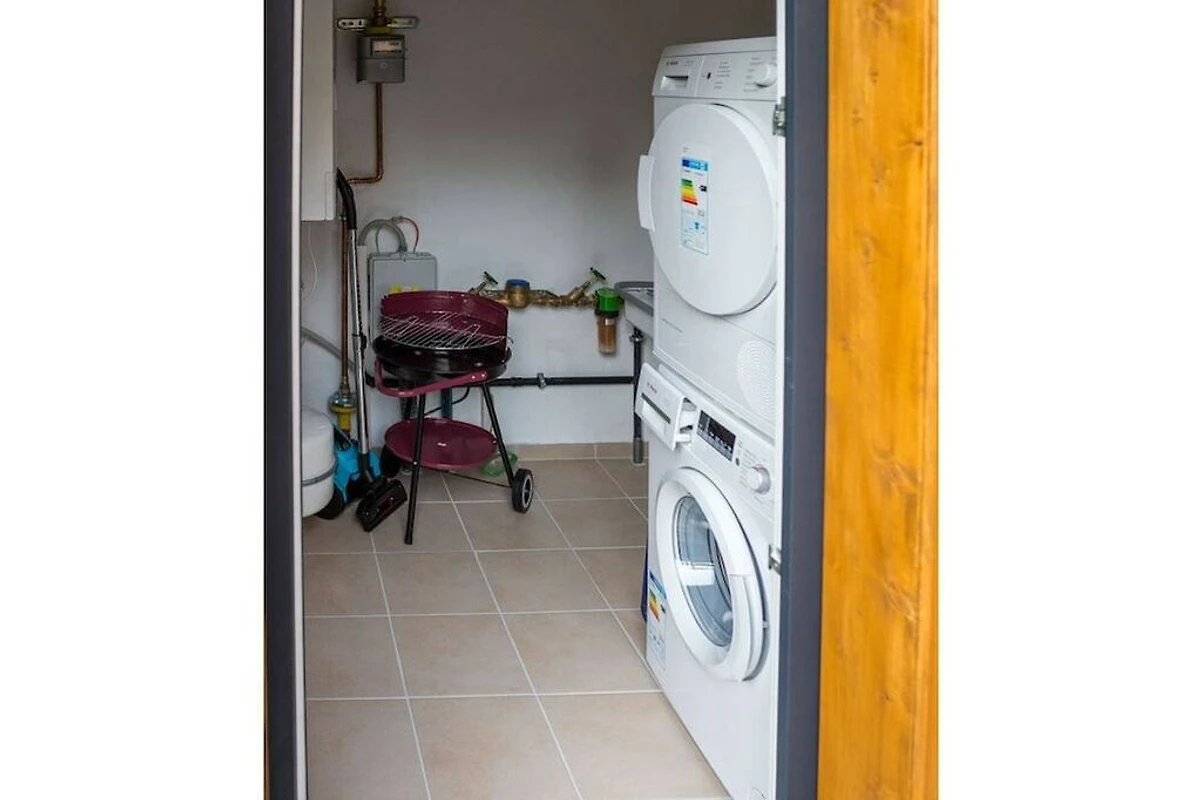 - 1 Hauswirtschaftsraum mit Waschmaschine, Trockner, Staubsauger und Reinigungsutensilien