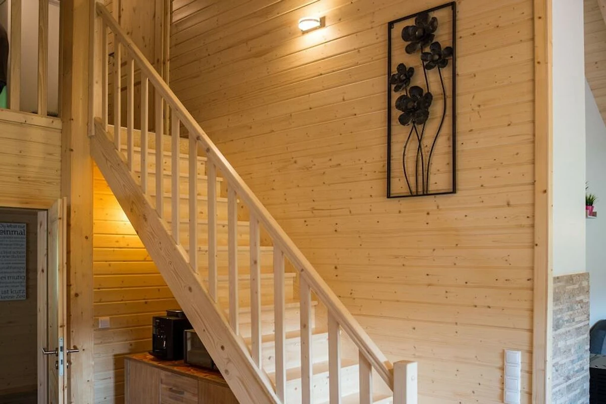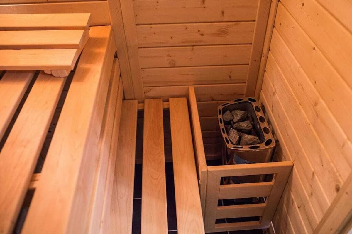 Parterre: (Wohnzimmer(, , TV, Herd), Esszimmer(Esstisch), Küche(Esstisch, Kochplatte, Wasserkocher, Toaster, Kaffeemaschine, Backofen, Mikrowelle, Spülmaschine, Kühlschrank, Tiefkühlschrank, Küchenmaschine), Schlafzimmer(, , Doppelbett, TV), Schlafzimmer(, , Doppelbett), Badezimmer(, , Toilette, Badewanne, Dusche, Dusche, Waschbecken, Föhn), Badezimmer(, , Toilette, Sauna, Dusche, Waschbecken, Föhn))